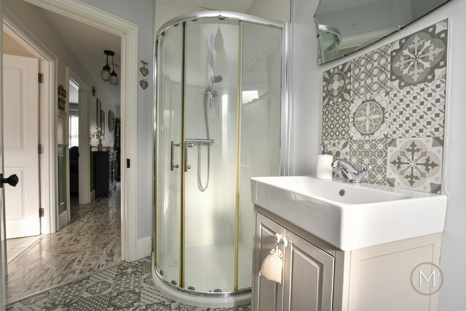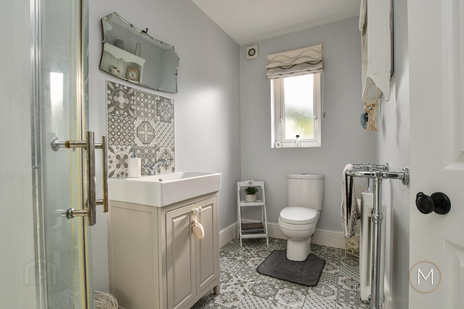 Luxury white suite comprising of low flush W.C; wash hand basin with vanity unit; heated towel radiator; extractor fan; tiled floor; quadrant style shower cubicle with mains powered shower