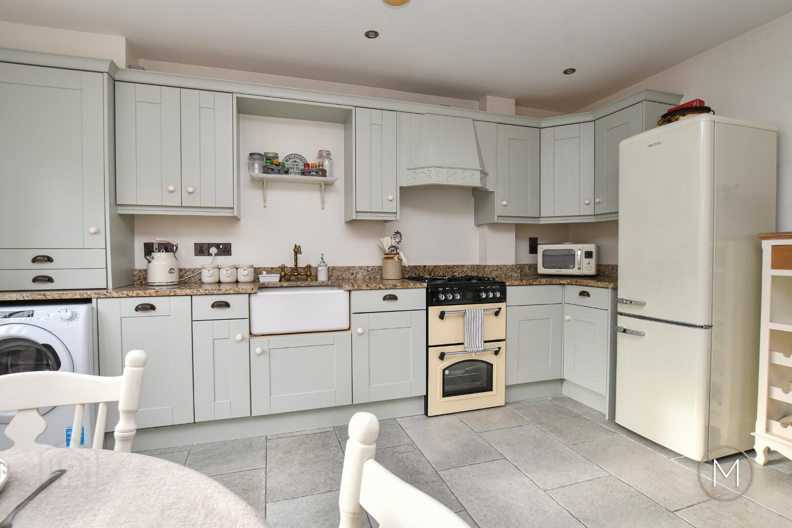 Modern fully fitted kitchen comprising of an excellent range of high and low level units; range cooker with canopy style extractor; Belfast sink; granite work surfaces with matching upstand; plumbed for washing machine; concealed gas boiler; spotlighting; tiled floor; glass panelled door to rear garden
