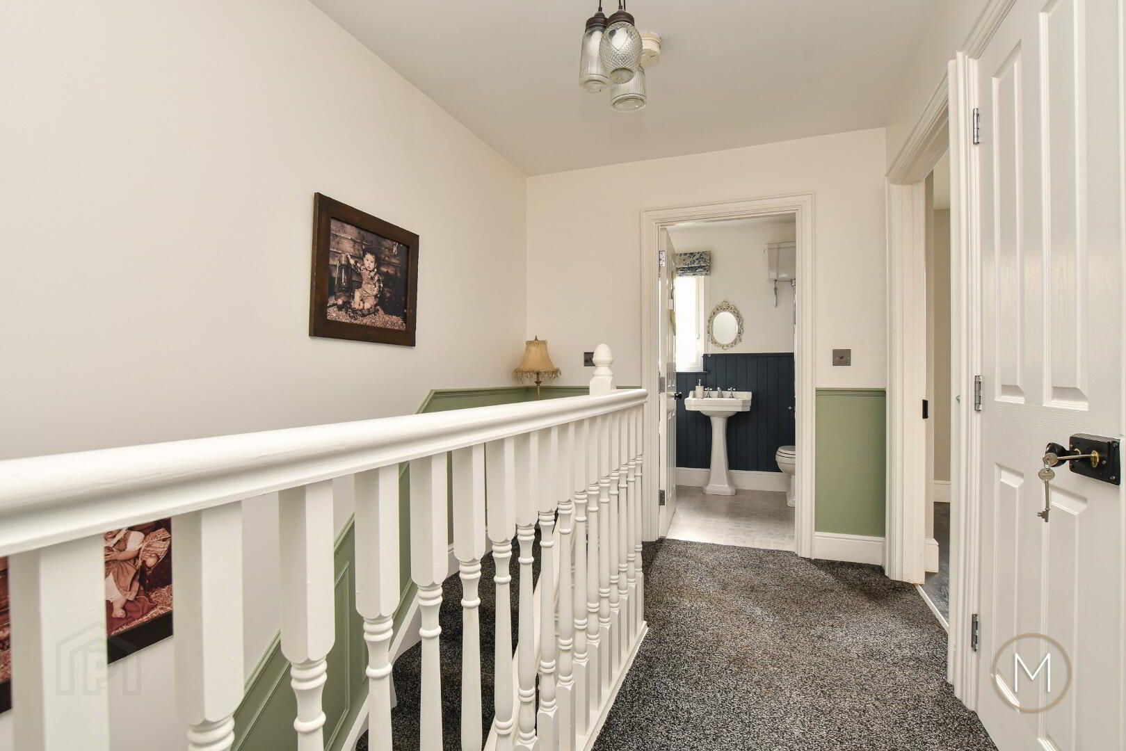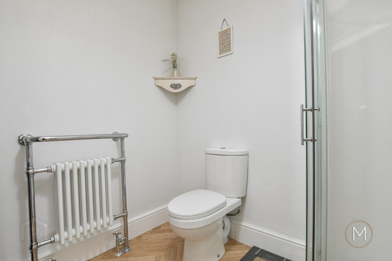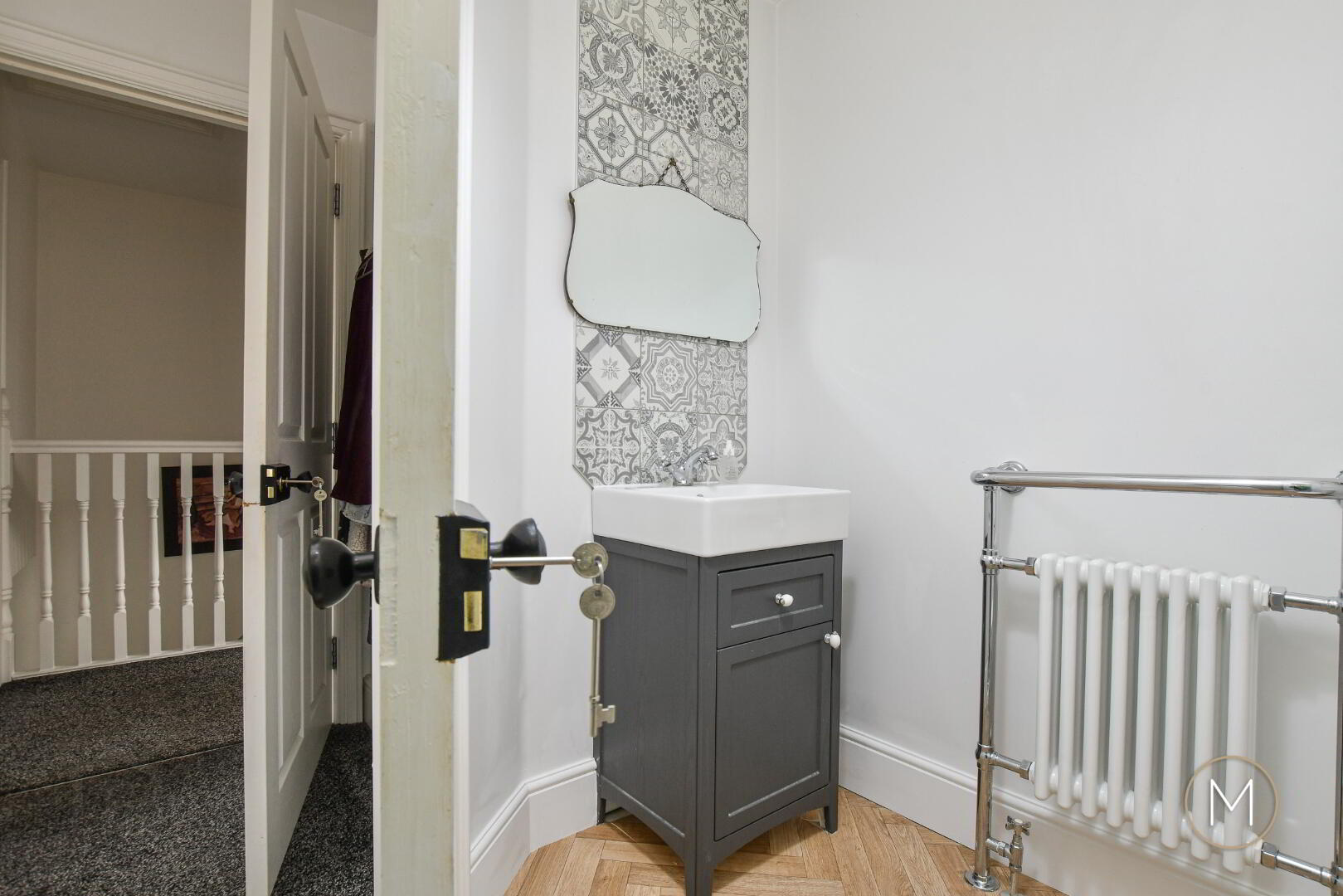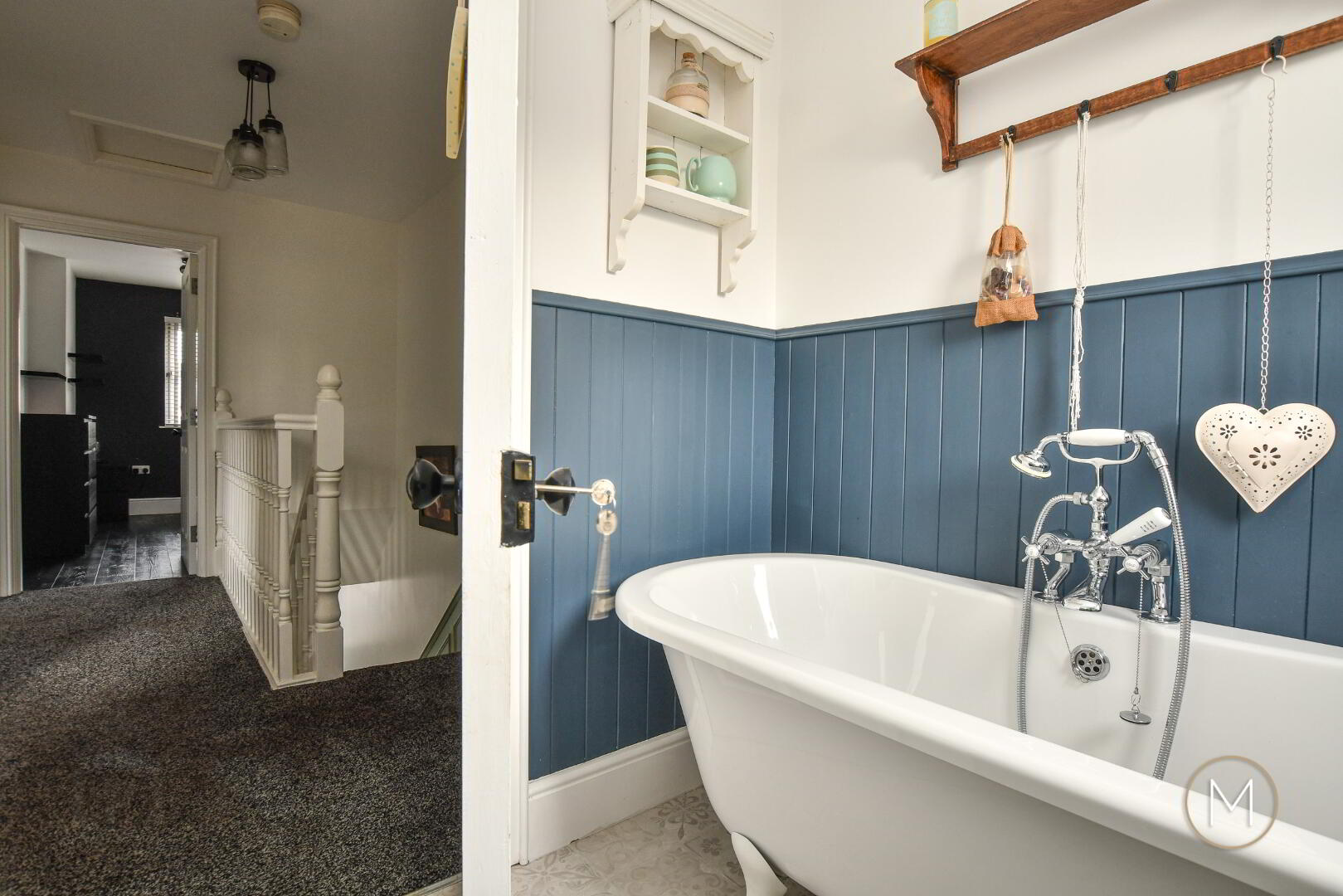 Upstairs, you’ll find three well-proportioned bedrooms, each beautifully presented. The master bedroom benefits from a contemporary ensuite shower room, while the main bathroom exudes boutique hotel charm, complete with a freestanding bathtub, elegant wall panelling and modern finishes.