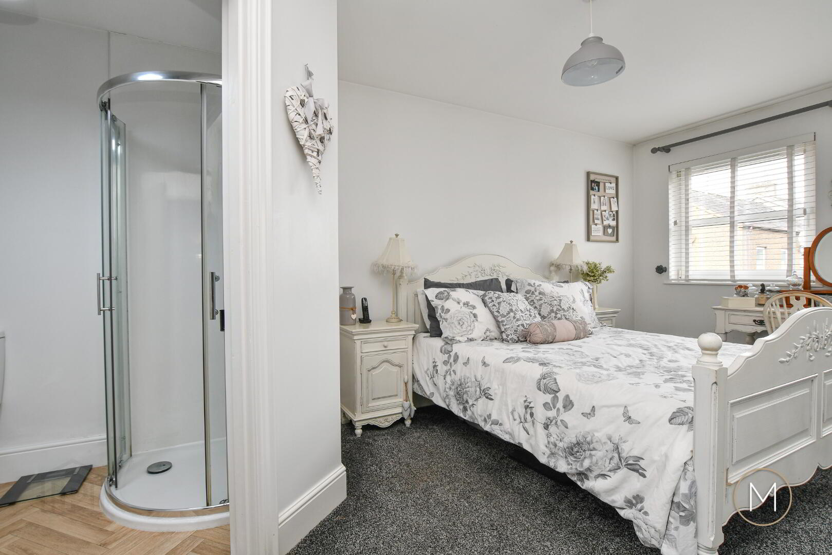 At the heart of the home lies a modern kitchen and dining area, designed with both style and functionality in mind. Featuring sleek cabinetry, quality appliances and ample space for family dining, this room flows naturally out to the private rear garden – a large paved patio area that’s easy to maintain and perfect for summer barbecues or outdoor gatherings. A convenient ground floor shower room adds to the home’s practicality.