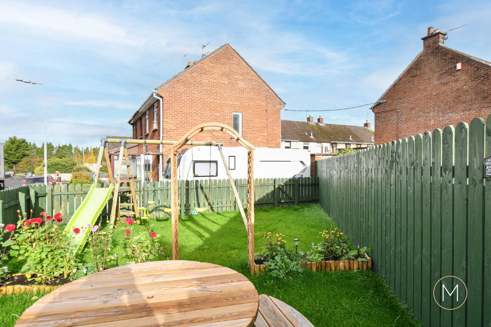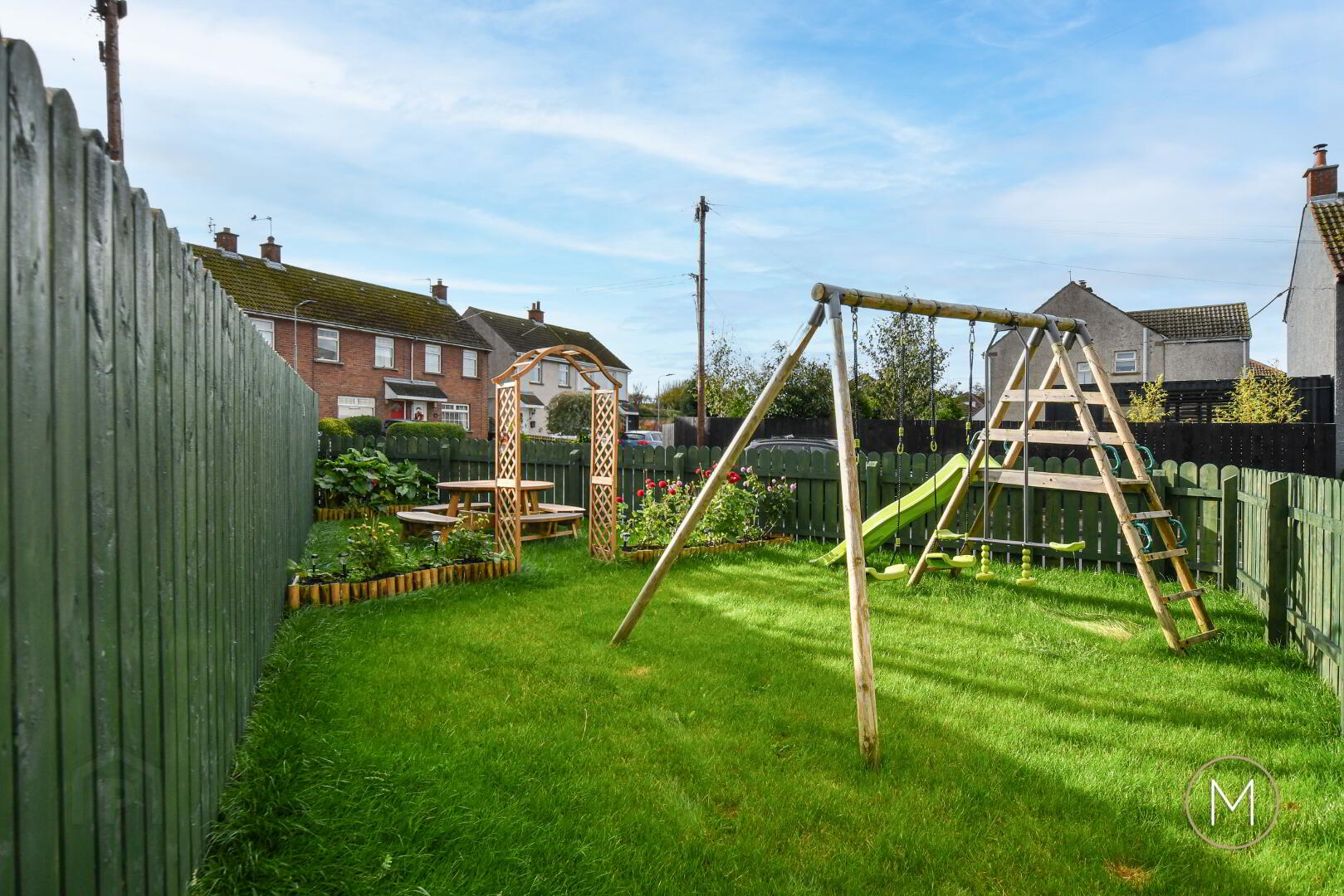 Large side garden enclosed by fencing and laid in lawn with various plants