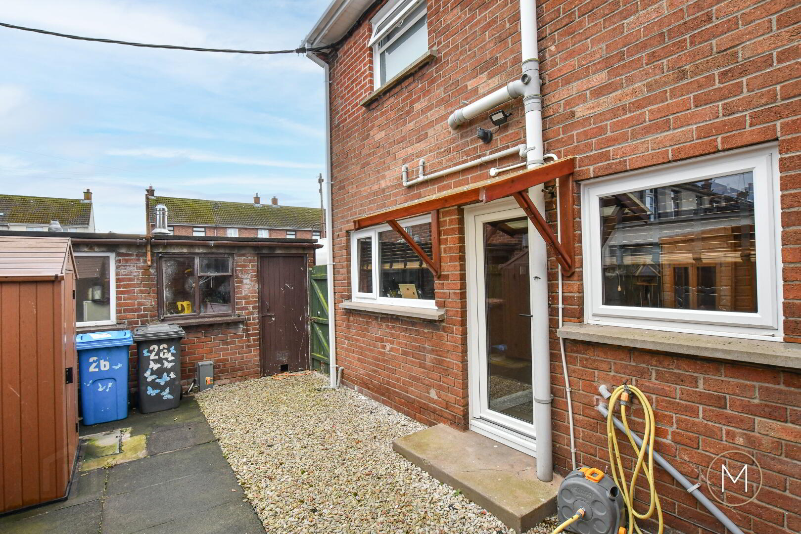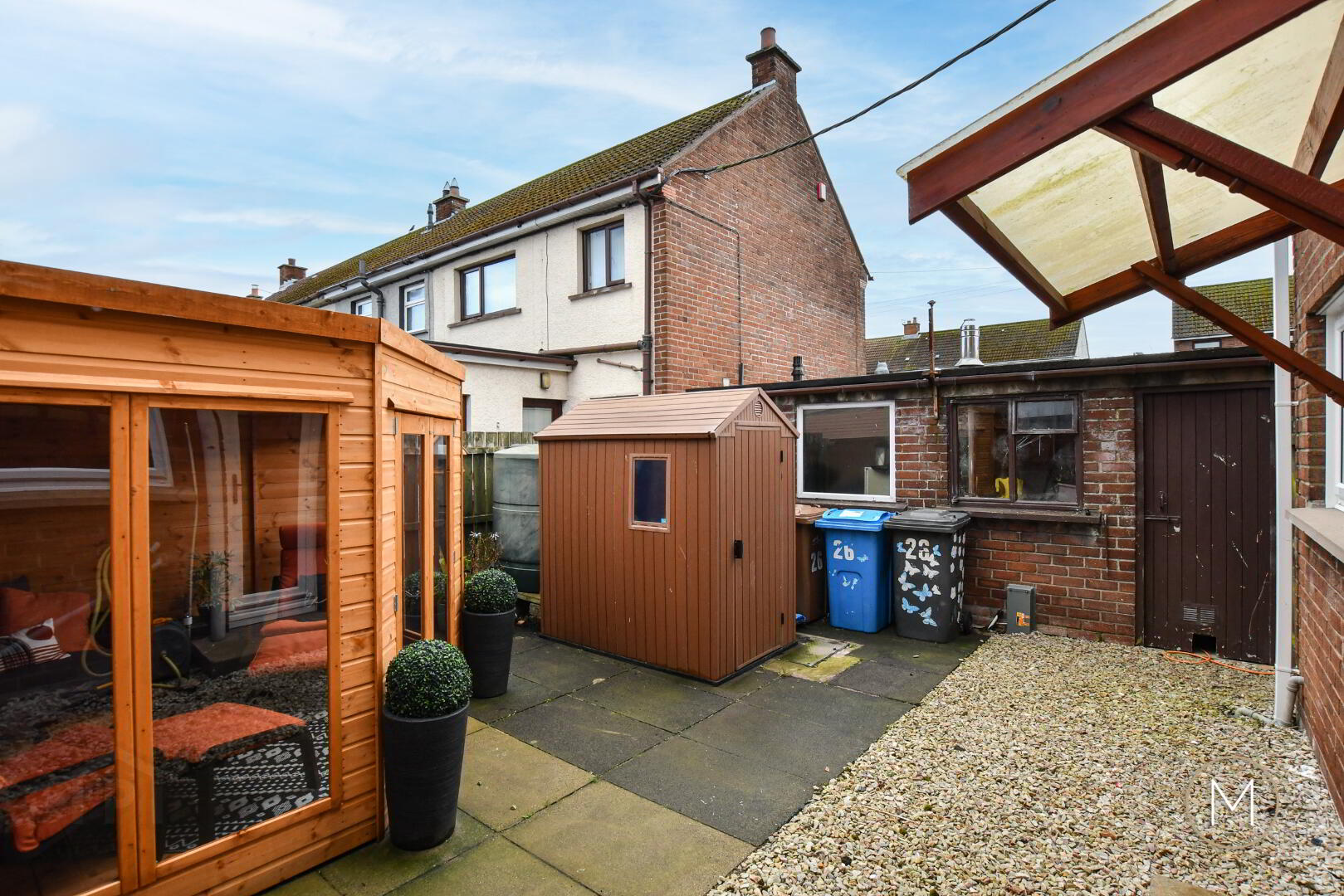 Private and enclosed rear garden area with loose stone area and paved patio; exterior lighting; outside water tap; outbuilding for storage with power and oil boiler; PVC oil tank