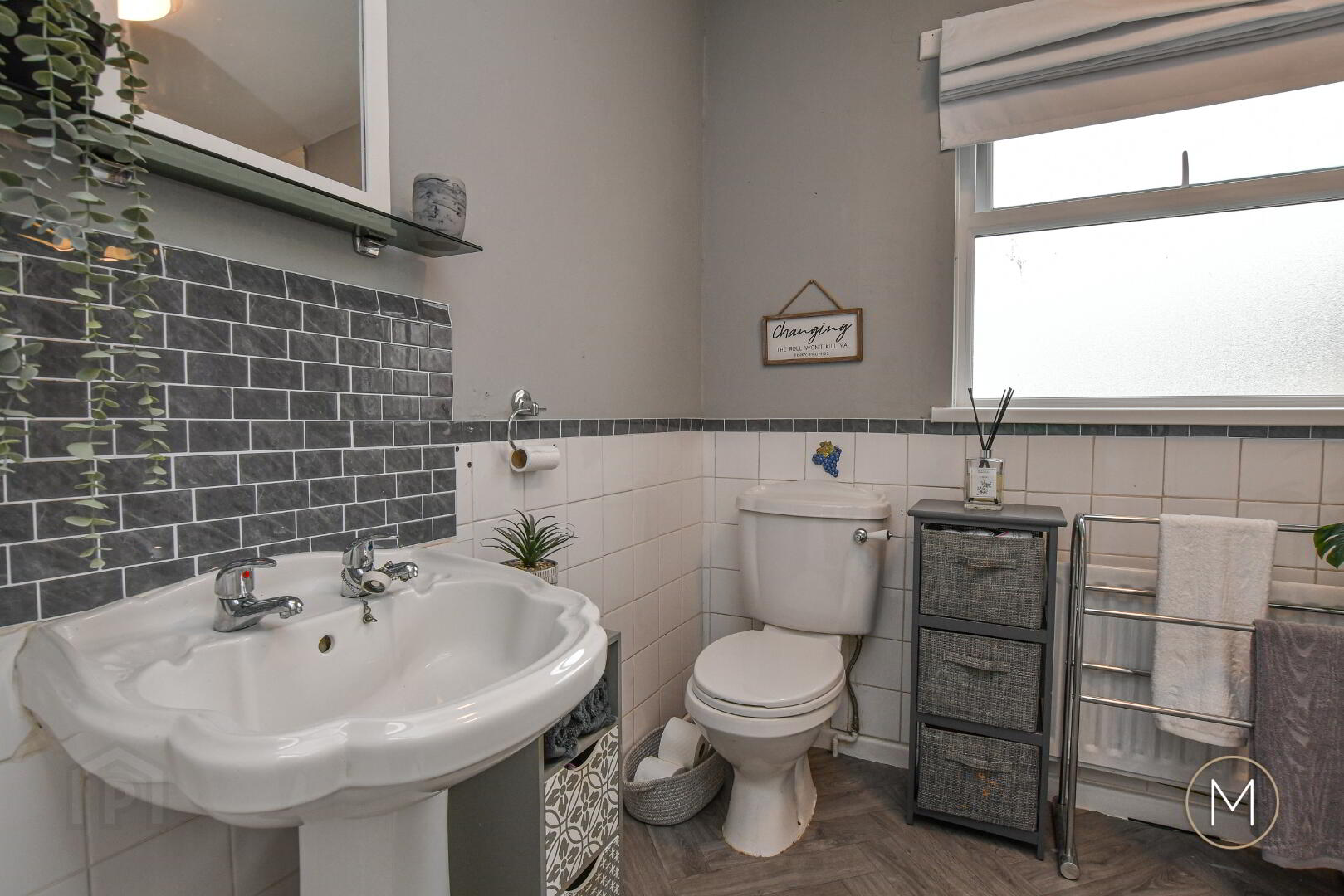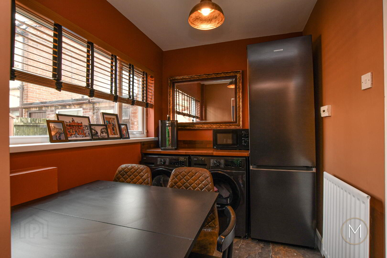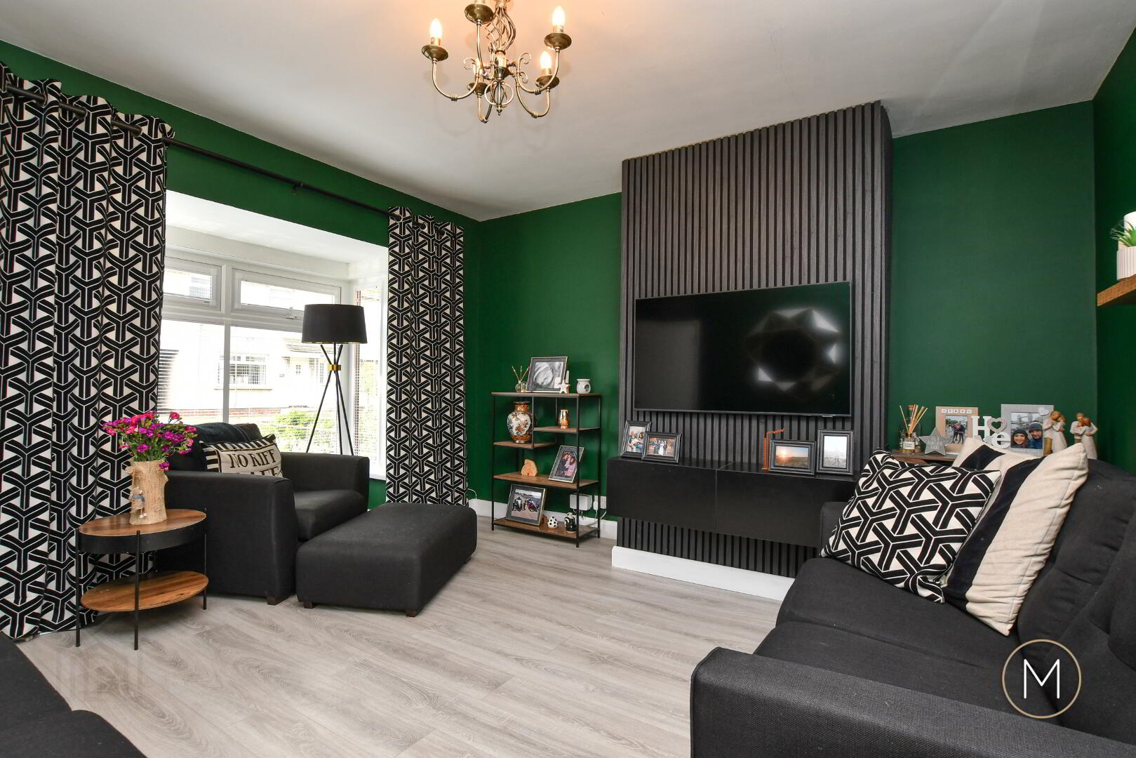 Wood laminate flooring; bay window; feature wall panelling; understairs storage