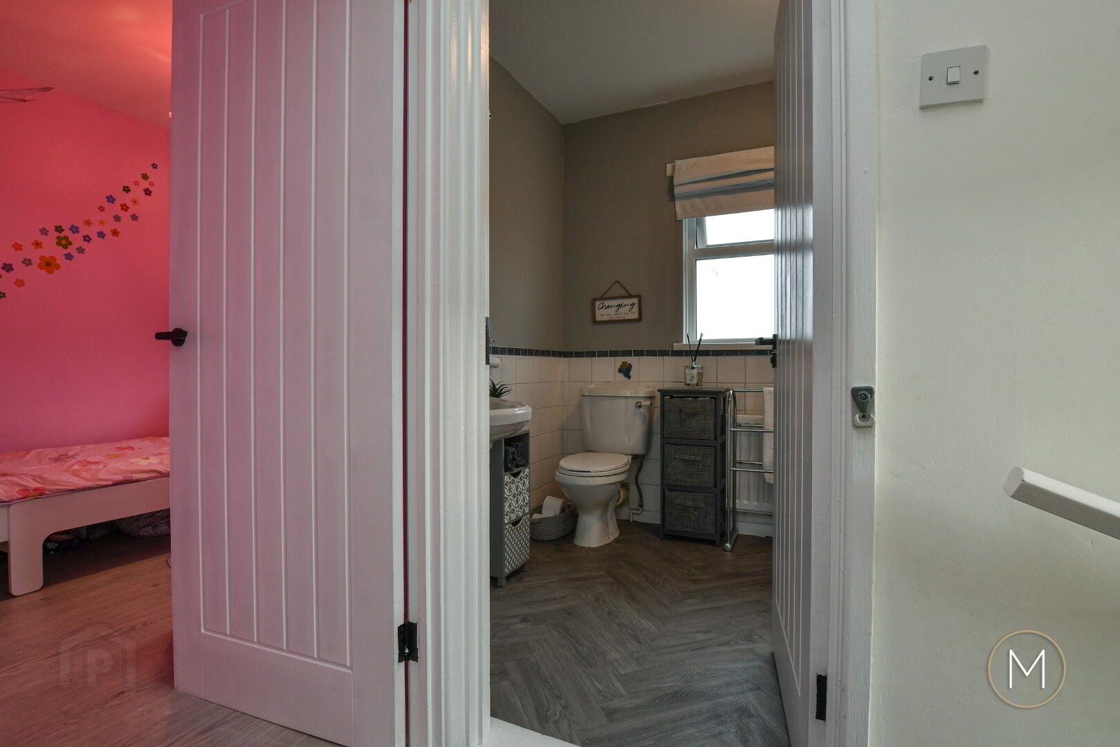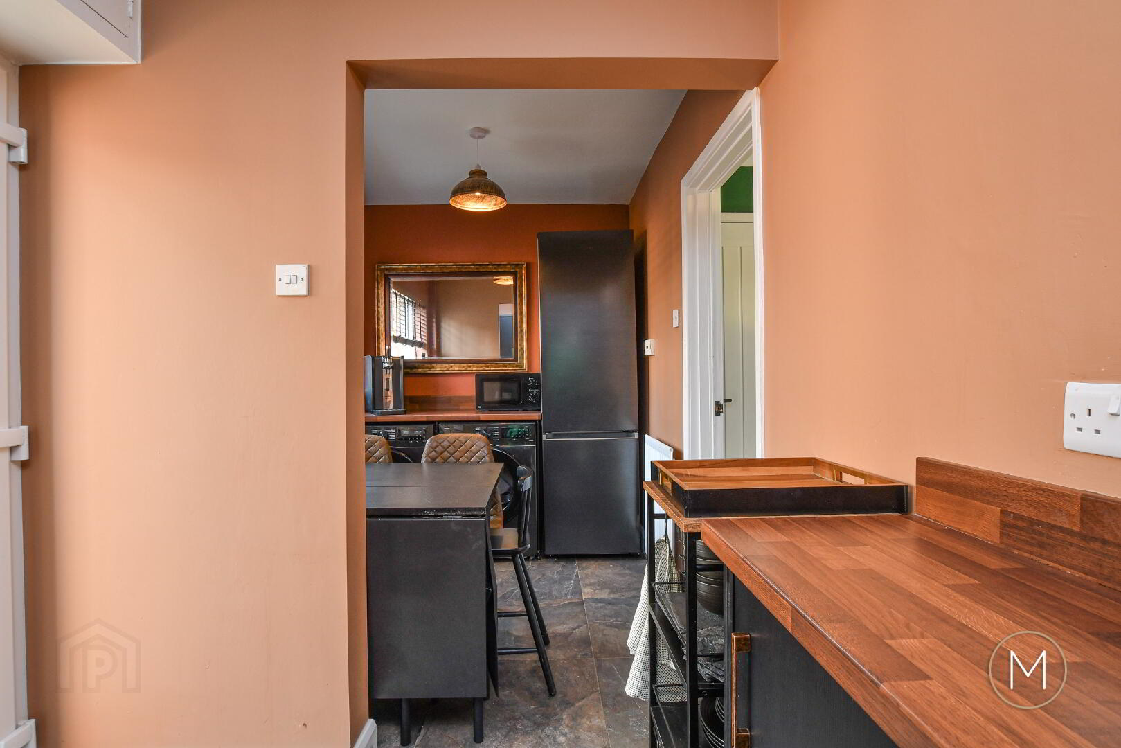 To the rear, the fully fitted kitchen boasts sleek units and quality finishes, opening into a separate dining area—a perfect space for entertaining or relaxed family meals. Upstairs, there are two well-proportioned double bedrooms, each finished in neutral tones, and a main bathroom with an attractive white suite, completing this impressive interior.