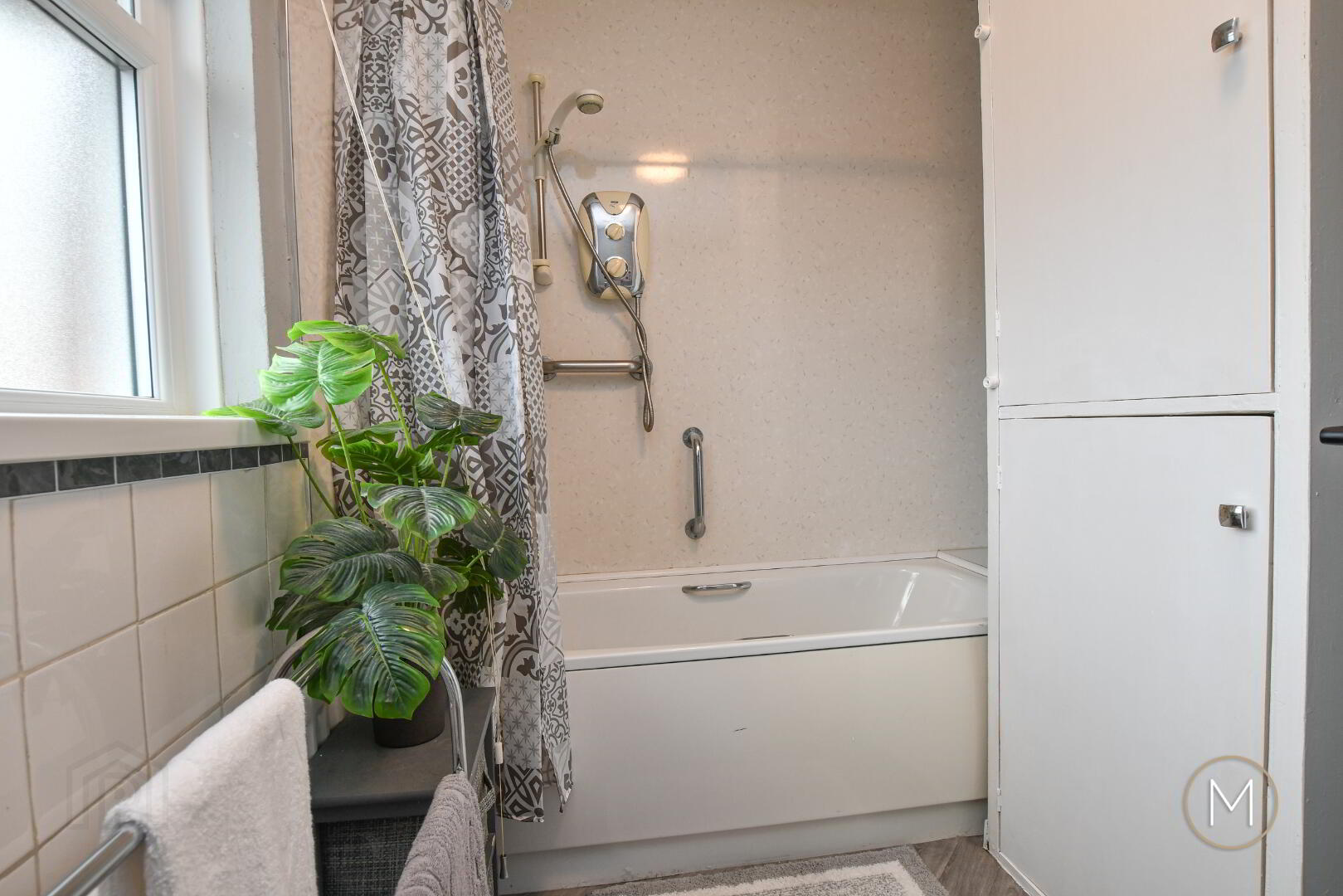 Attractive white suite comprising of panelled bath with overhead electric shower; low flush W.C; wash hand basin; partially tiled walls; hot-press and storage
