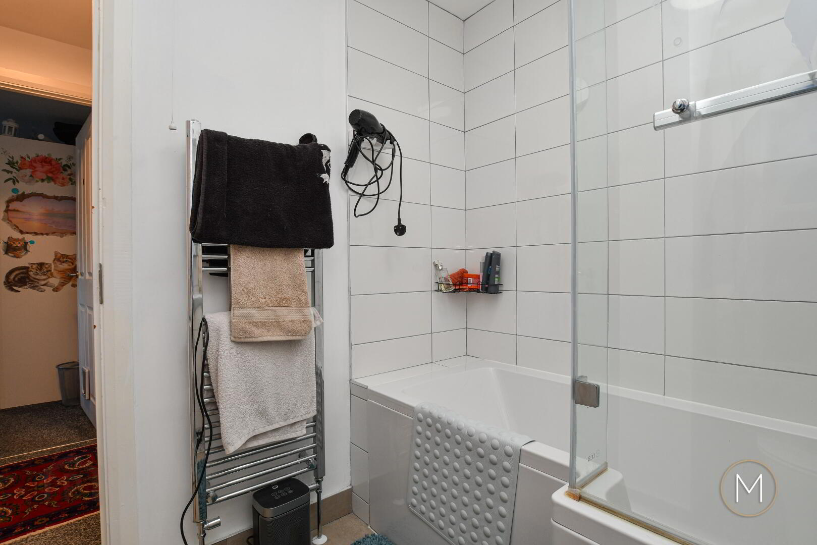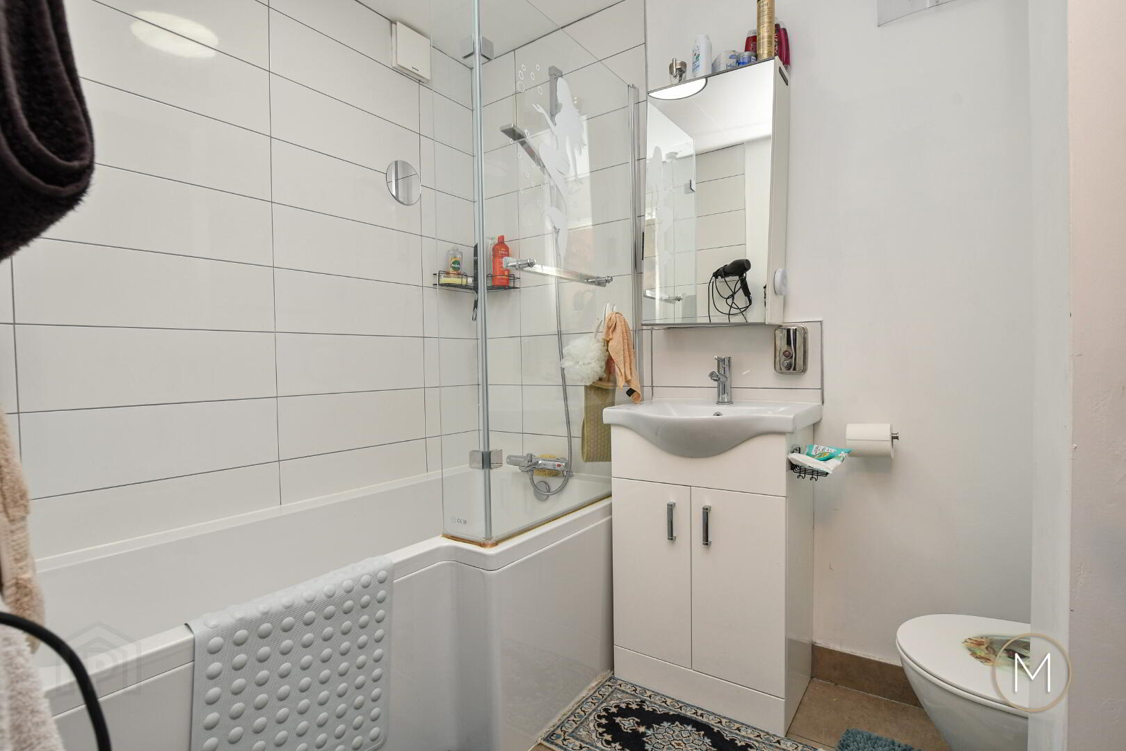 Contemporary fitted white suite comprising of P-shaped bath with chrome mixer taps and shower attachment and glass shower screen; wash hand basin with vanity unit; low flush W.C; tiled floor; partially tiled walls; chrome towel radiator; extractor fan