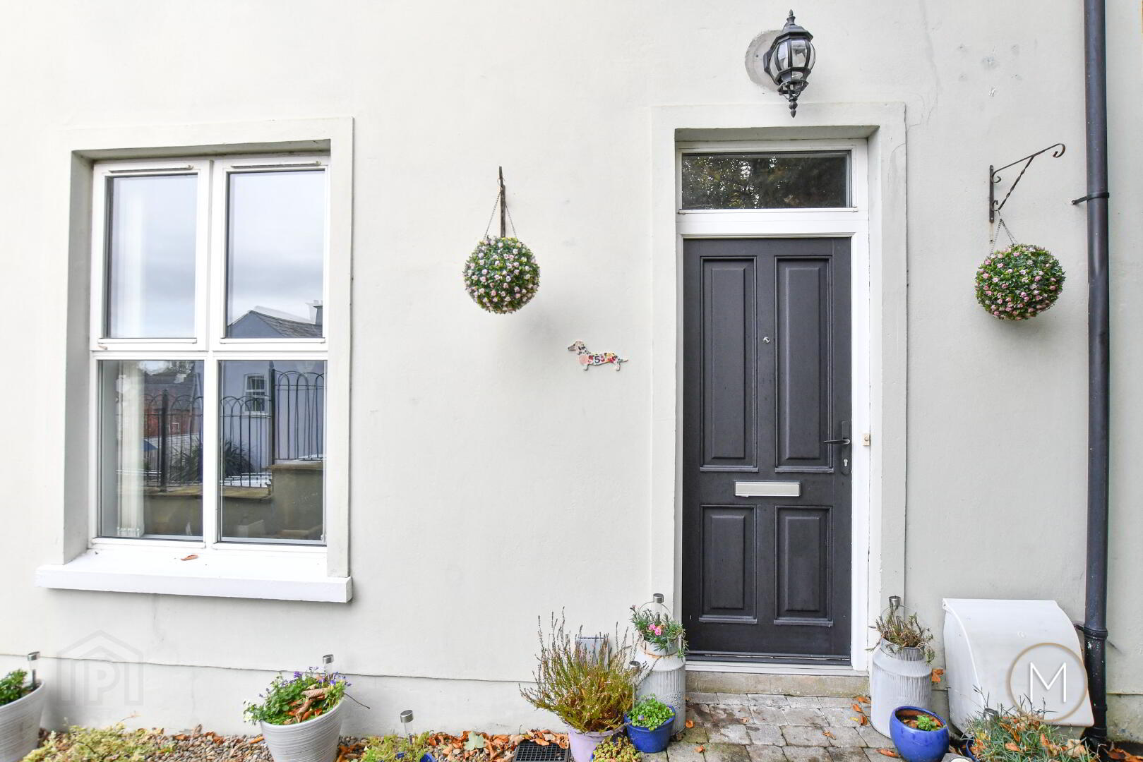 Loose stone area to immediate front of house for pots or plants; exterior lighting