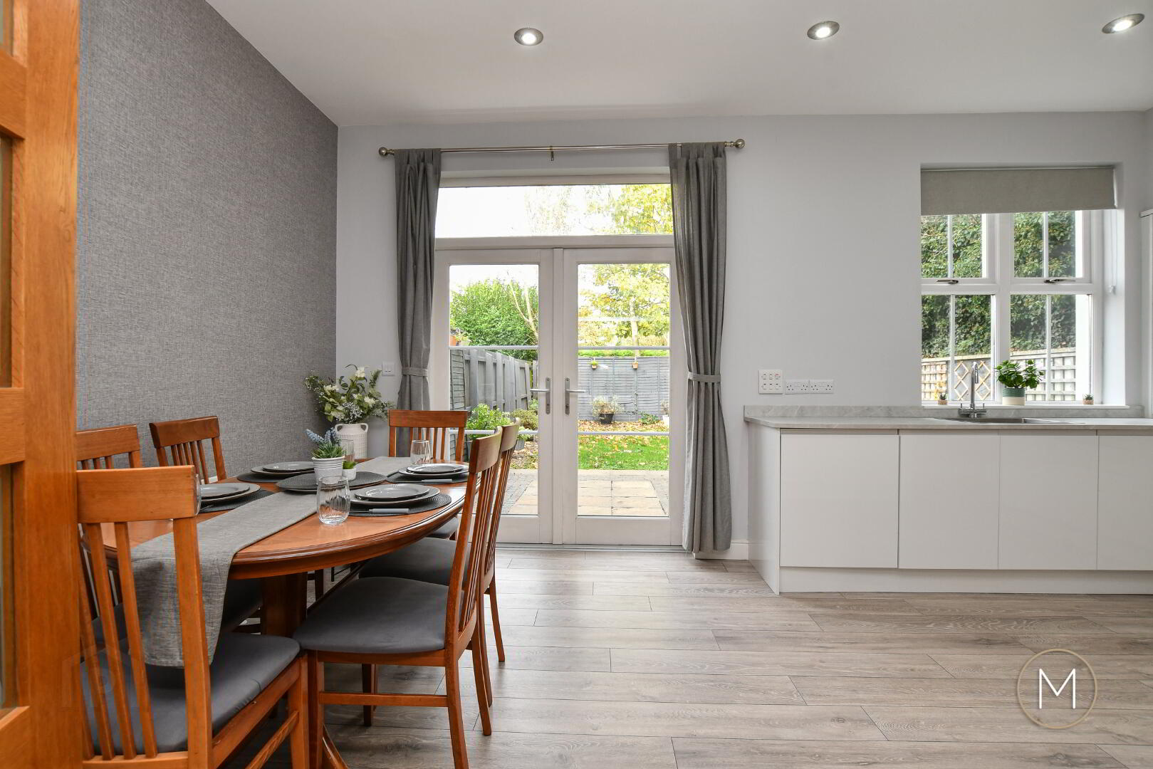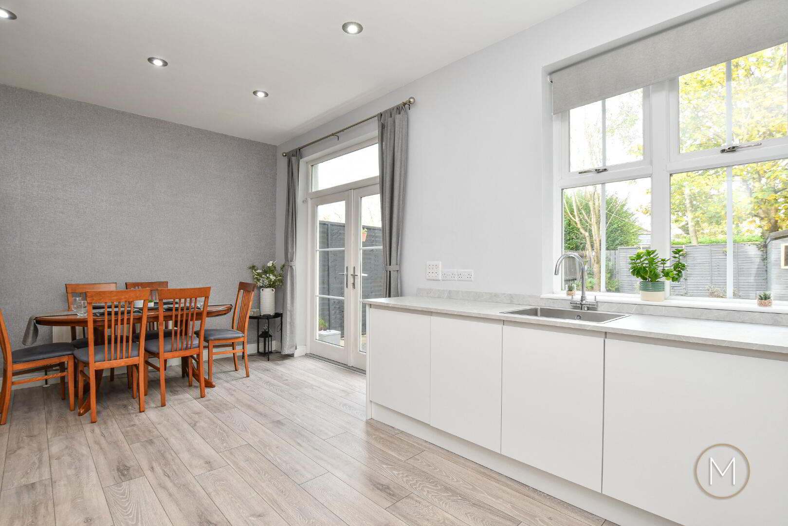 Glazed French-style doors open through to the show-stopping kitchen and dining area — a sleek, modern space that has been recently upgraded by the current owner. The kitchen includes a wide range of integrated appliances, ample workspace, and a design that blends practicality with style. The adjoining dining area benefits from glazed double doors leading to the private rear garden, while a convenient downstairs W.C. completes the ground floor.