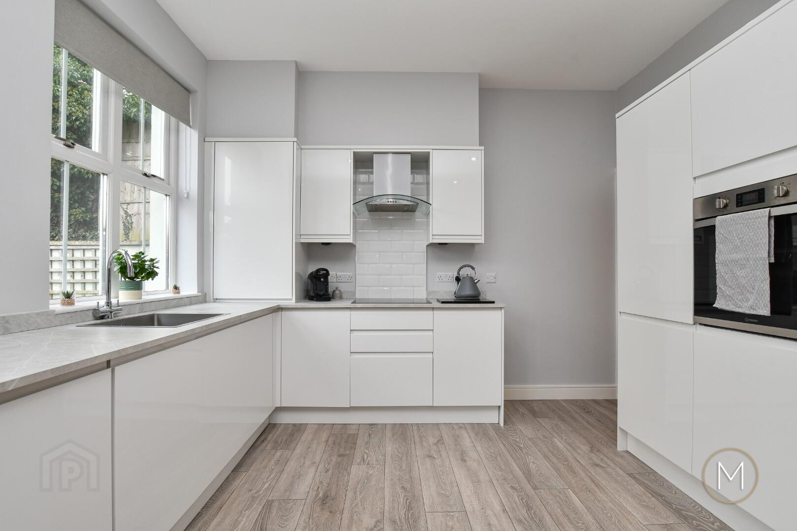 Modern fully fitted kitchen with an excellent range of high and low high gloss units; built in oven, ceramic hob, tiled splashback and stainless steel extractor fan with glass canopy; Formica style work surfaces; undermounted stainless steel sink unit; integrated fridge freezer; integrated dishwasher; integrated washing machine; concealed gas boiler; spotlighting; wood laminate flooring; glazed double doors to back garden
