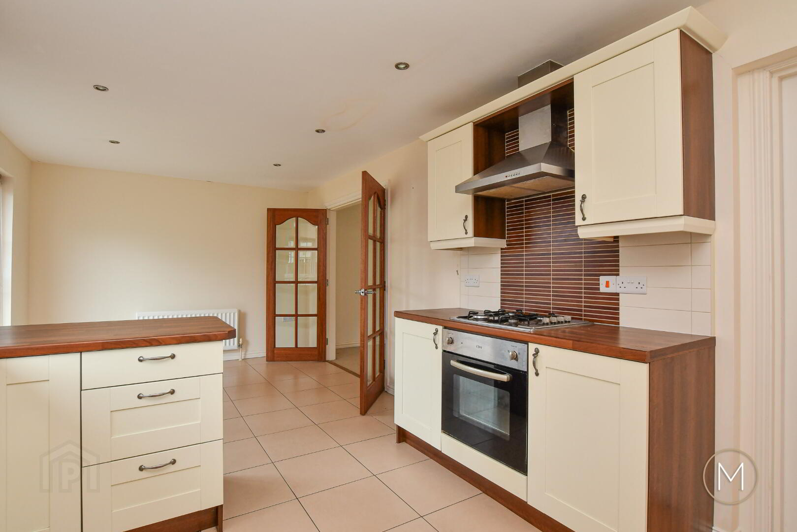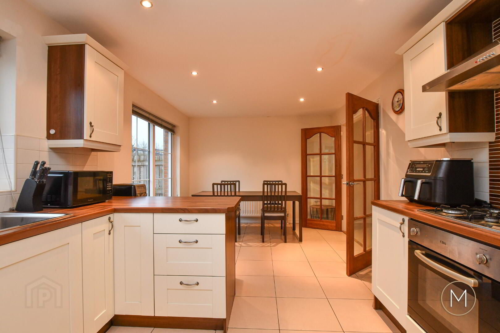 Modern fully fitted kitchen comprising of an excellent range of high and low level units; integrated fridge freezer; 1 ½ bowl stainless steel sink unit; integrated dishwasher; Formica style work surfaces; integrated cooker, gas hob and stainless steel extractor fan; tiled splashback; spotlighting; sliding PVC doors to rear garden