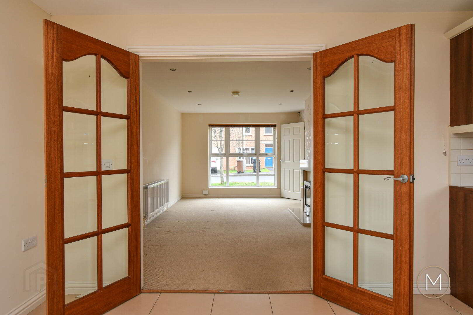 Feature fireplace with electric insert; understairs storage cupboard; spotlighting; glazed French style doors to;