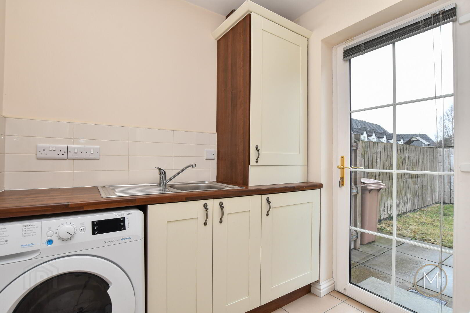 To the rear of the home is a modern, open-plan fully fitted kitchen with ample dining space. This is a fantastic area for everyday family living and entertaining alike. The dining area benefits from sliding patio doors which open directly onto the enclosed rear garden, allowing for seamless indoor-outdoor living. A separate utility room provides additional storage and workspace and offers the convenience of its own external door. A downstairs WC completes the ground floor accommodation.