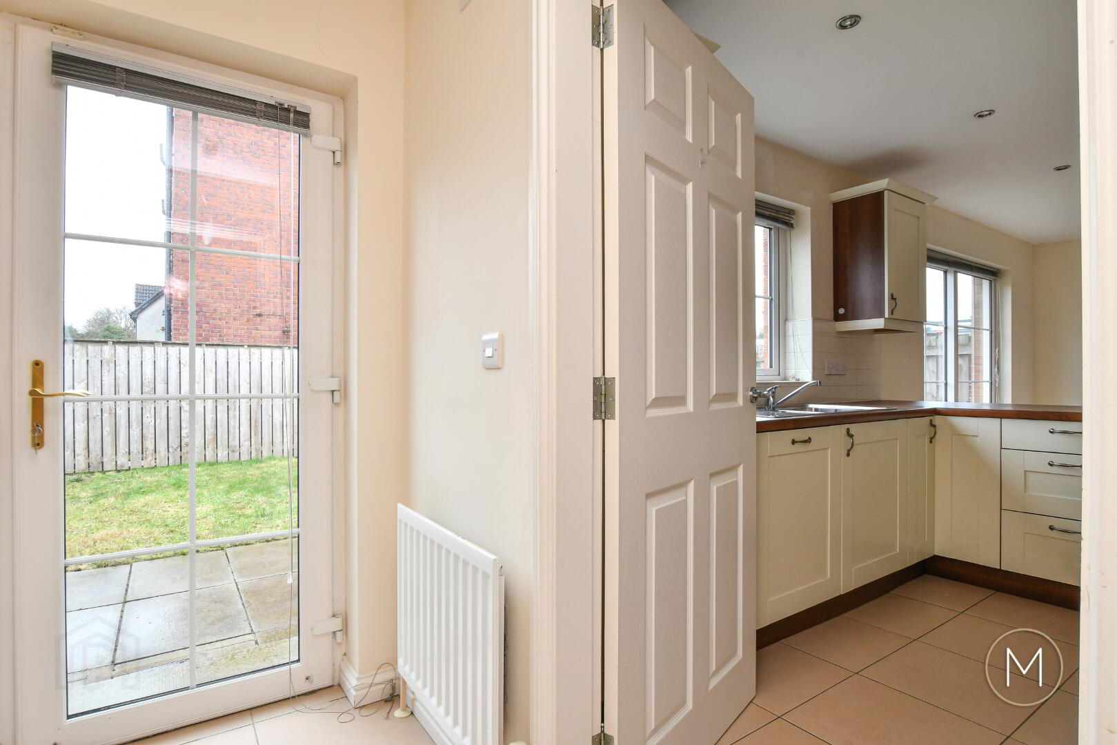 Matching kitchen units at high and low level; single drainer stainless steel sink unit; plumbed for washing machine; tiled splashback; tiled flooring; glass panelled PVC door to rear