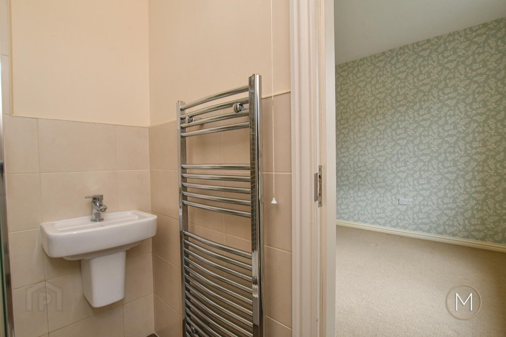 Luxury fitted white suite comprising of low flush W.C; wash hand basin; quadrant, tiled shower cubicle with electric shower; partially tiled walls; tiled floor; extractor fan