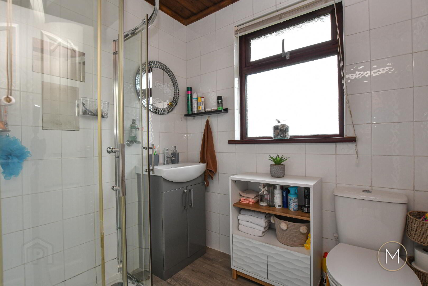 White suite comprising of low flush W.C; wash hand basin with vanity unit; quadrant shower cubicle with electric shower; pine panelled ceiling; tiled walls