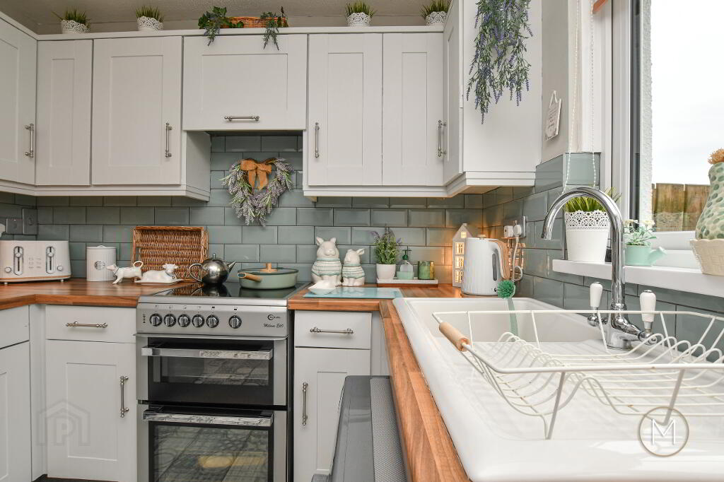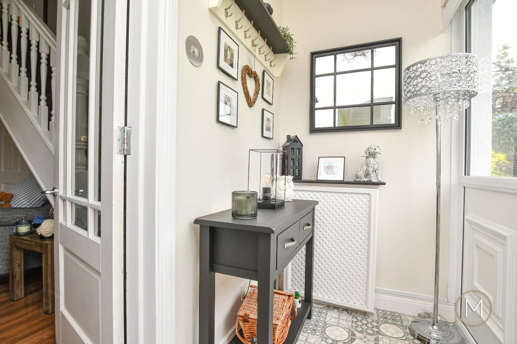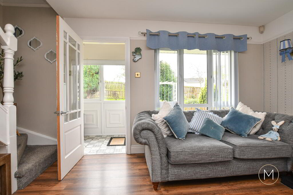 On entering the home, you’re greeted by a bright and welcoming porch that leads into a spacious living room, complete with a charming feature fireplace and open fire—ideal for cosy evenings. The kitchen is modern and functional, offering a clean, neutral finish.