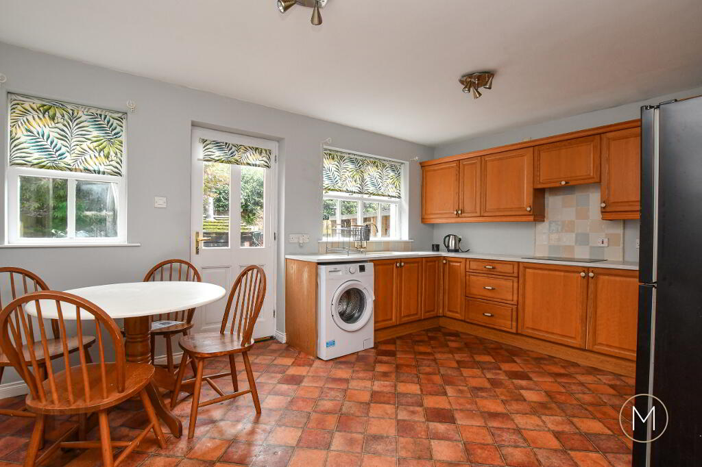 Modern fully fitted kitchen comprising of an excellent range of high and know level units; Formica work surfaces; integrated oven, ceramic hob and concealed extractor; plumbed for washing machine; single drainer sink unit; understairs storage; glass panelled hardwood door to rear