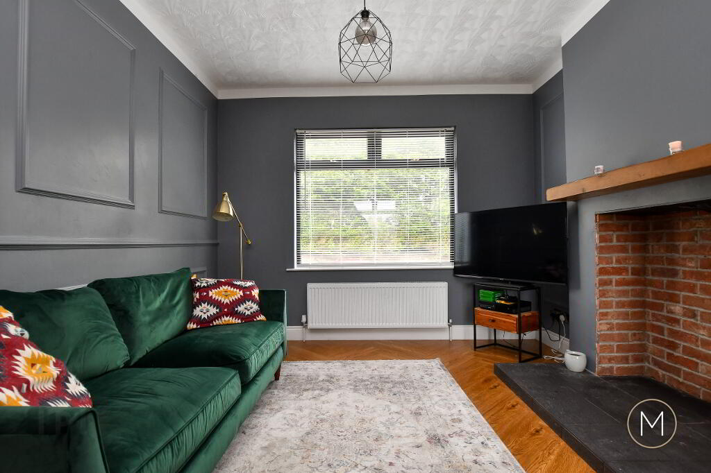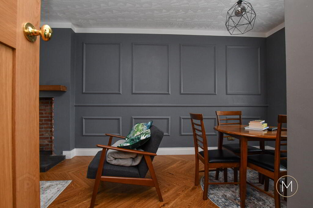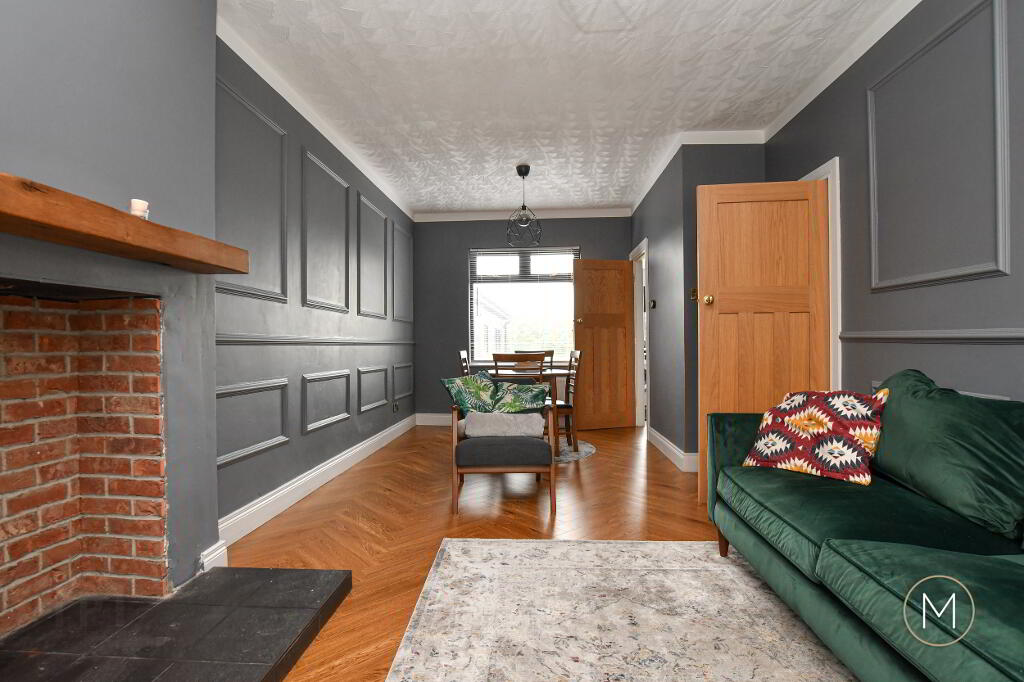 Step into a welcoming ceramic-tiled entrance porch, leading into a hallway finished with warm wood flooring – setting the tone for the tasteful interiors throughout. The open plan living and dining space is a standout feature, boasting elegant wall panelling and an exposed brick chimney breast with wooden mantle – ready for stove installation to create a cosy focal point.