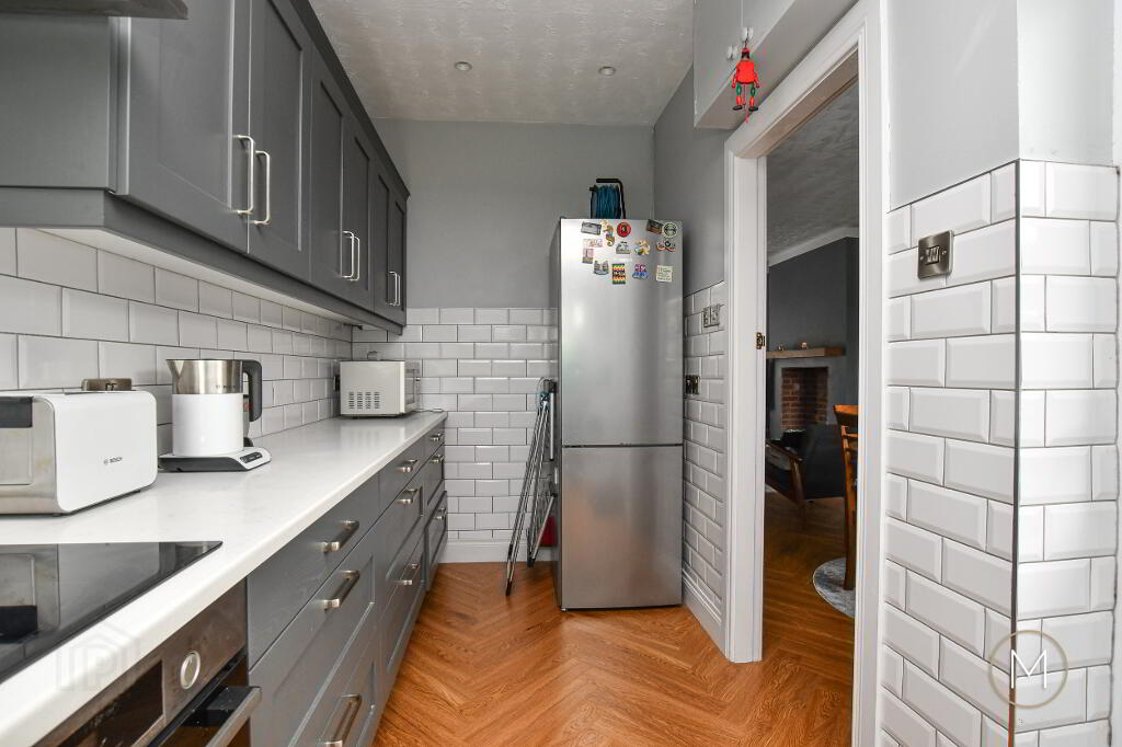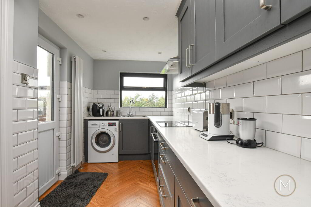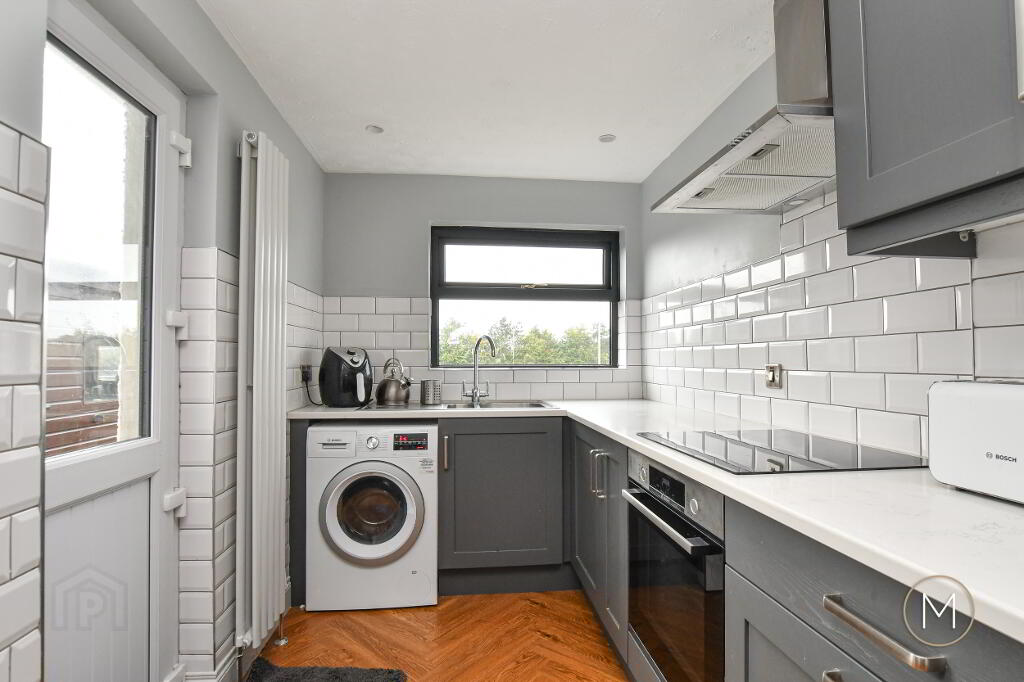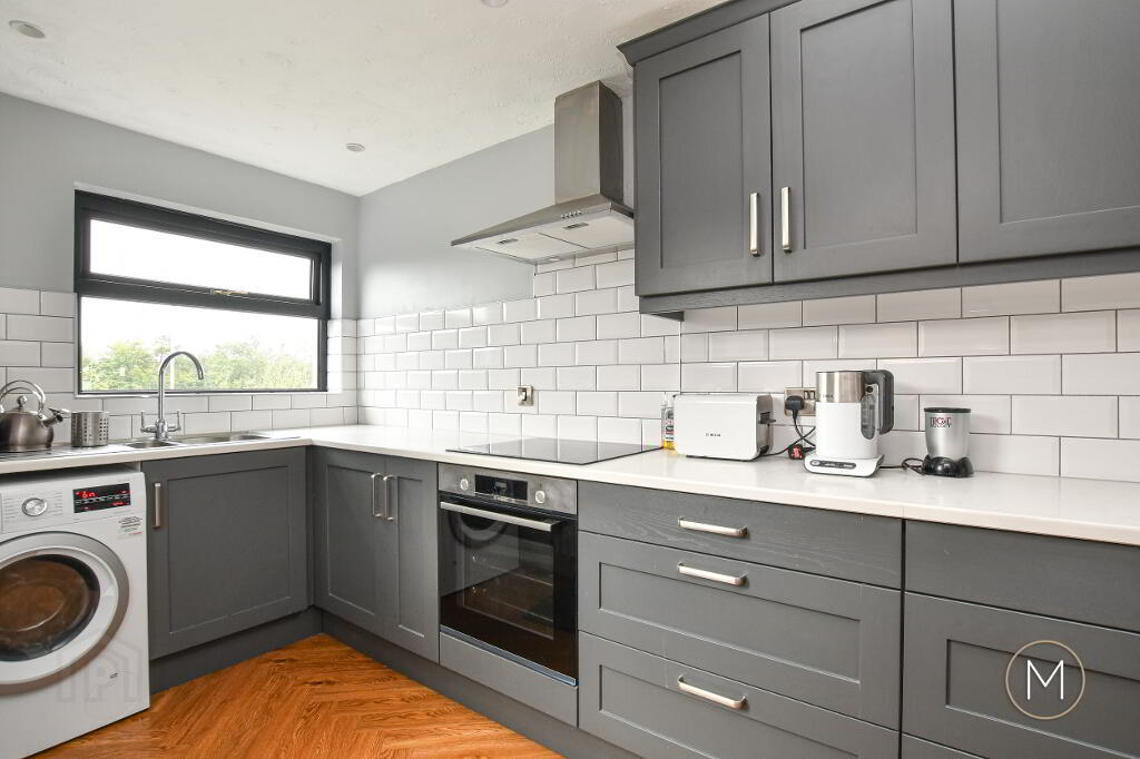 Modern fully fitted Shaker style kitchen comprising of an excellent range of high and low level units; integrated cooker, ceramic hob and stainless steel extractor hood; plumbed for washing machine; 1 ½ bowl stainless steel sink unit; tiled splashback; wood flooring; spotlighting; glass panelled PVC door to rear; partially tiled walls