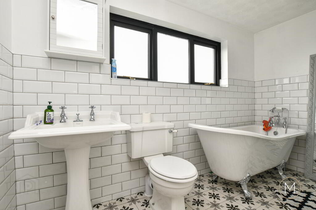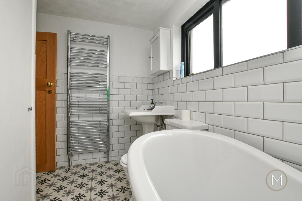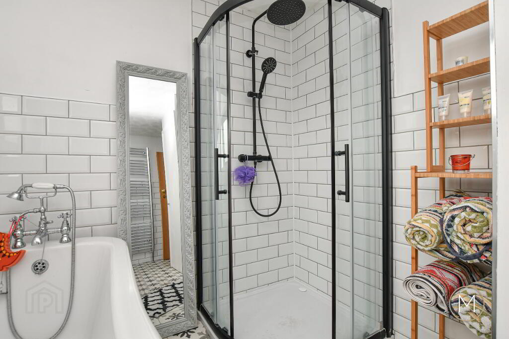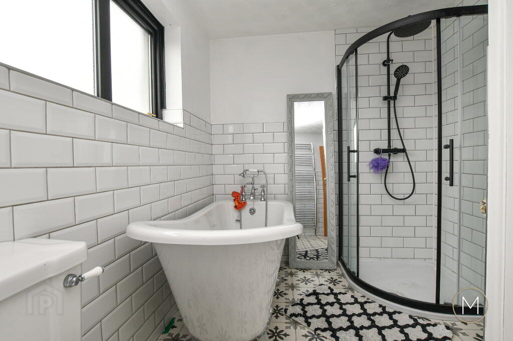 Luxury fitted white suite comprising of freestanding bath with chrome mixer taps and separate shower attachment; low flush W.C; wash hand basin; quadrant shower cubicle with Drench style fitting and separate shower attachment; tiled floor; partially tiled wall; chrome heated towel radiator; storage cupboard