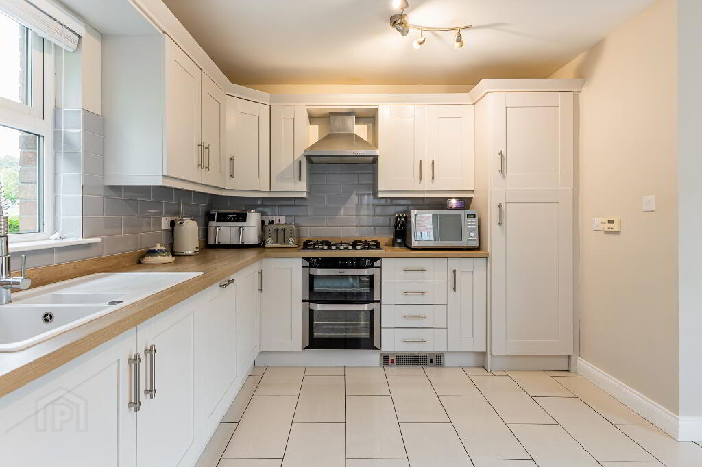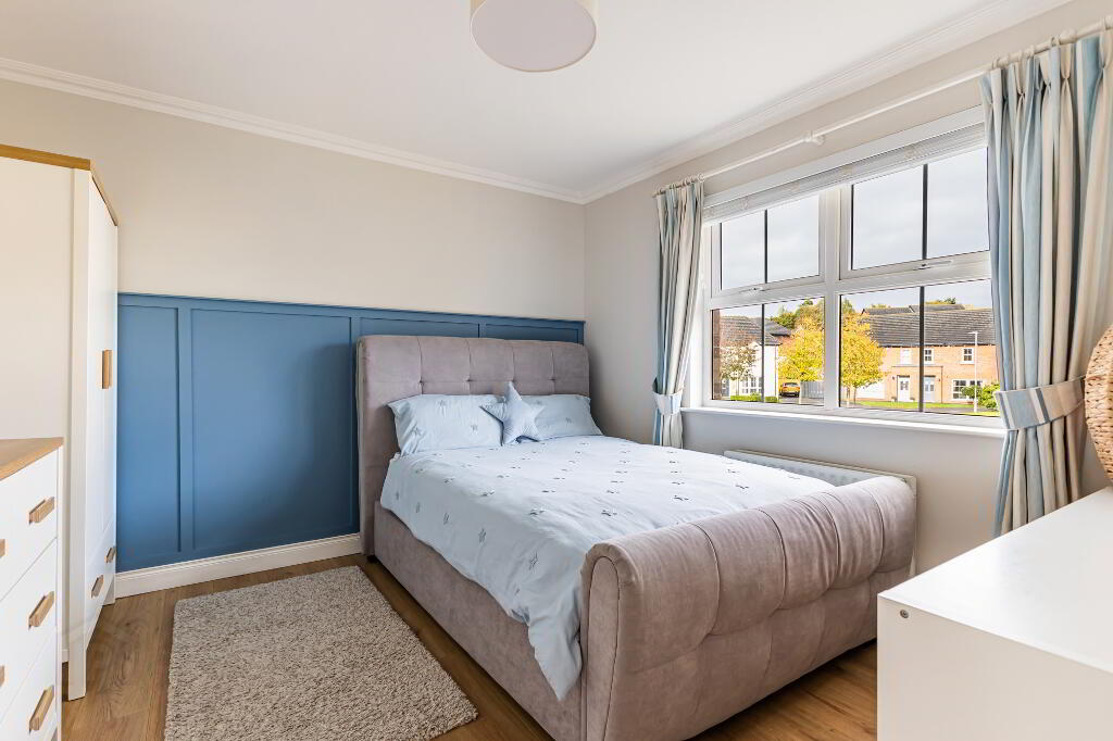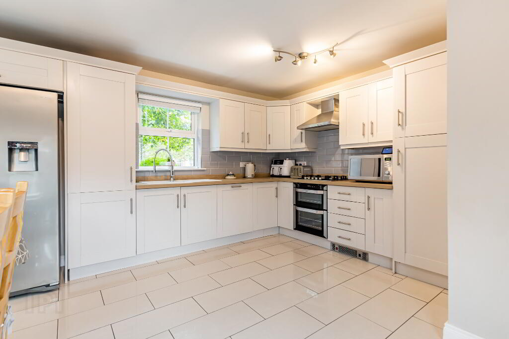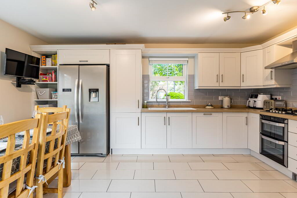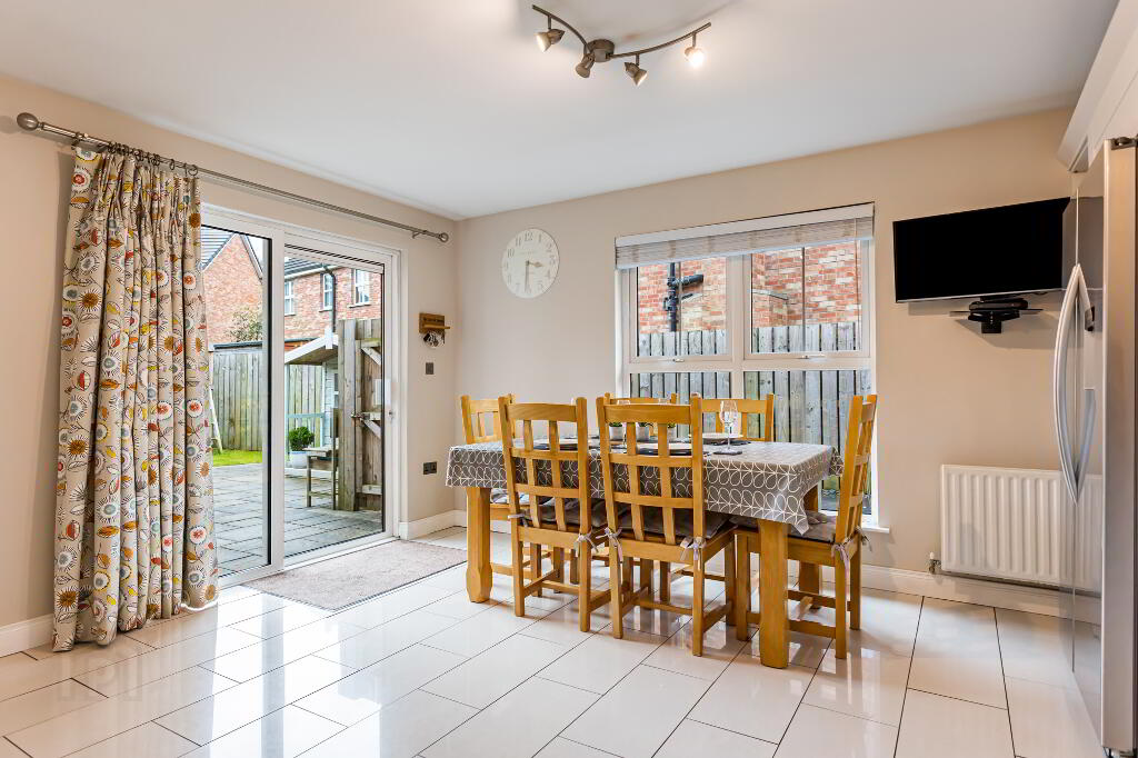 At the heart of the home is the modern open-plan kitchen and dining area, finished in clean, neutral tones. With sleek units, ample worktop space and contemporary fittings, it’s designed for both function and flair. Glazed sliding doors open directly onto the rear garden, allowing for effortless indoor/outdoor living — perfect for summer entertaining or keeping an eye on the kids.