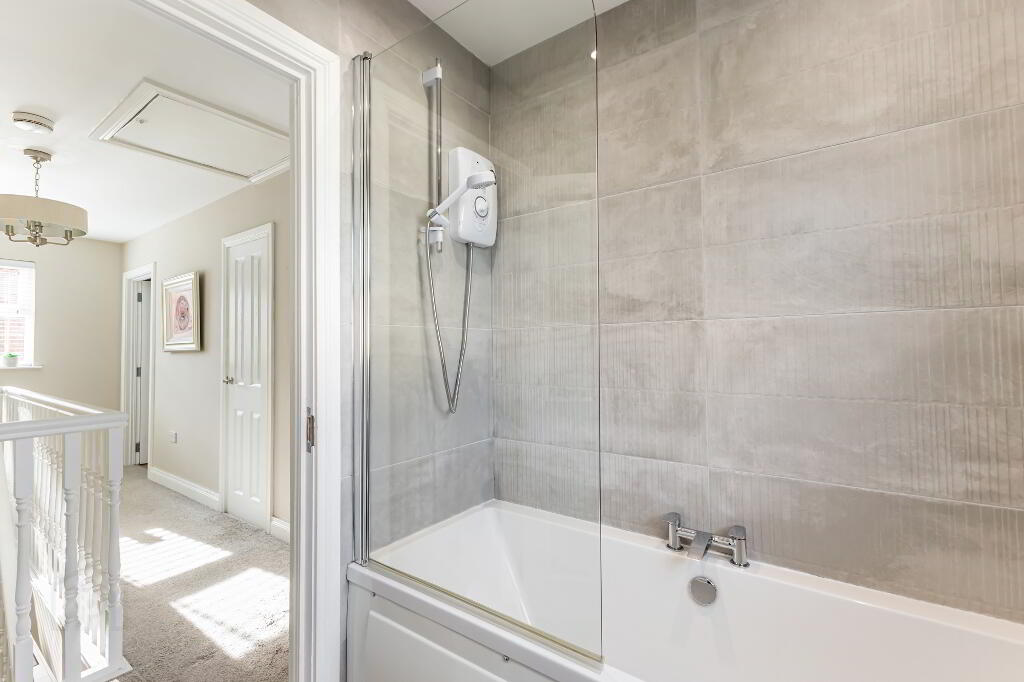 Contemporary fitted white suite comprising of low flush W.C; wash hand basin with vanity unit; panelled bath with chrome mixer taps, electric shower overhead and glass shower screen; mirrored cabinet; designer heated radiator; tiled floor and walls