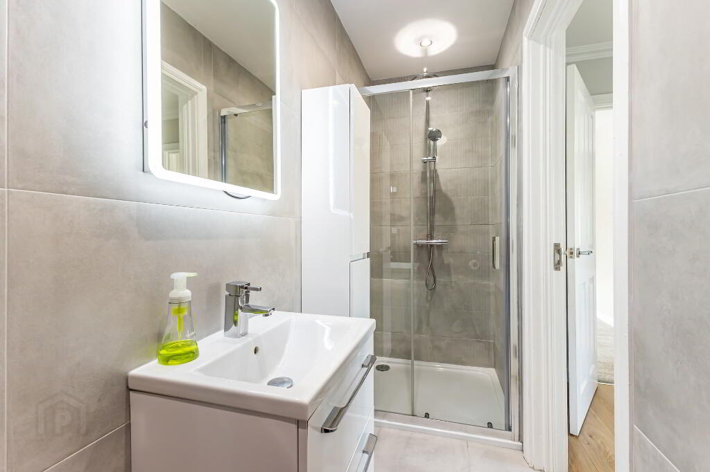 Modern white suite comprising of low flush W.C; wash hand basin with drawers; shower cubicle with Drench style shower and separate attachment; tiled floor and walls; spotlighting; illuminated wall mirror; designer heated radiator; extractor fan