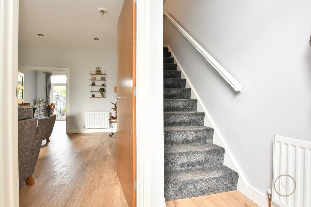 To the rear, enjoy a private, enclosed garden — a perfect mix of paved patio and lawn, ideal for entertaining or relaxing outdoors. To the front, a neat loose-stone area provides space for shrubs or decorative pots, adding to the home’s attractive kerb appeal. The property further benefits from gas heating and double-glazed windows, ensuring efficiency and comfort all year round.