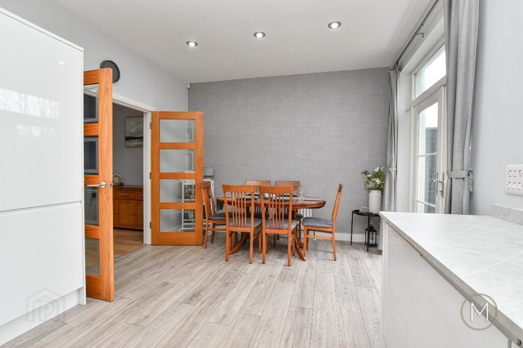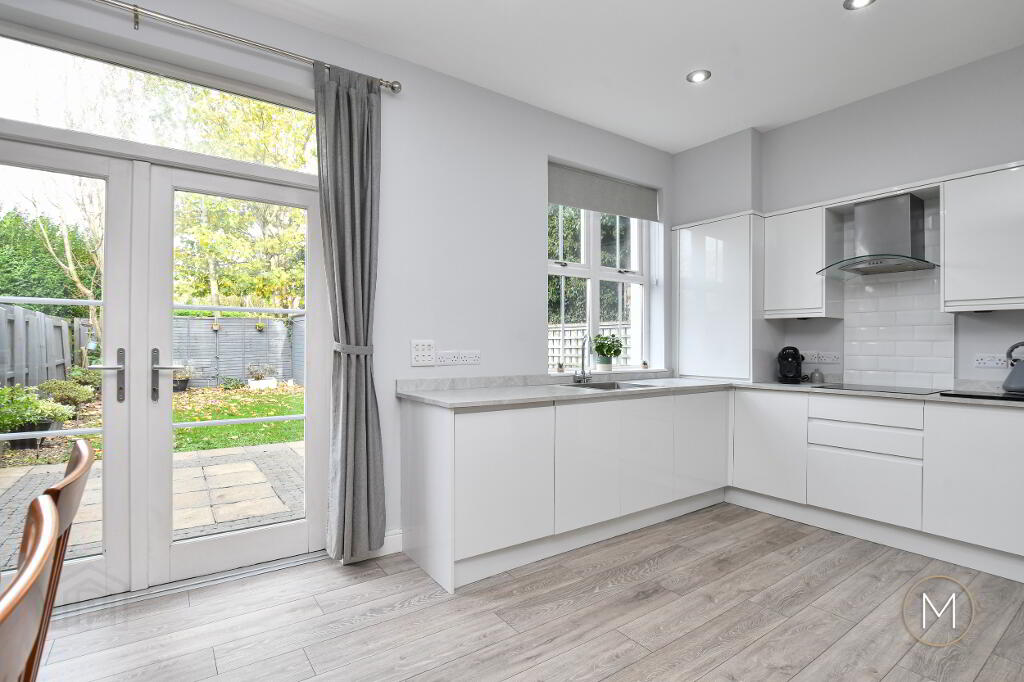 Glazed French-style doors open through to the show-stopping kitchen and dining area — a sleek, modern space that has been recently upgraded by the current owner. The kitchen includes a wide range of integrated appliances, ample workspace, and a design that blends practicality with style. The adjoining dining area benefits from glazed double doors leading to the private rear garden, while a convenient downstairs W.C. completes the ground floor.