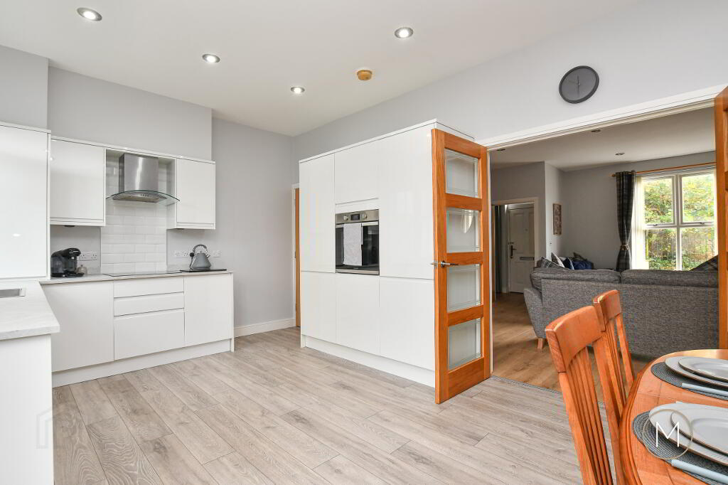 Modern fully fitted kitchen with an excellent range of high and low high gloss units; built in oven, ceramic hob, tiled splashback and stainless steel extractor fan with glass canopy; Formica style work surfaces; undermounted stainless steel sink unit; integrated fridge freezer; integrated dishwasher; integrated washing machine; concealed gas boiler; spotlighting; wood laminate flooring; glazed double doors to back garden