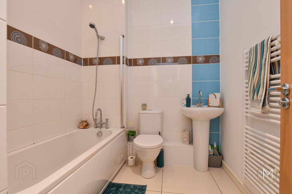 Modern 2-piec suite comprising of low flush W.C; wash hand basin with tiled splashback; extractor fan; wood laminate flooring