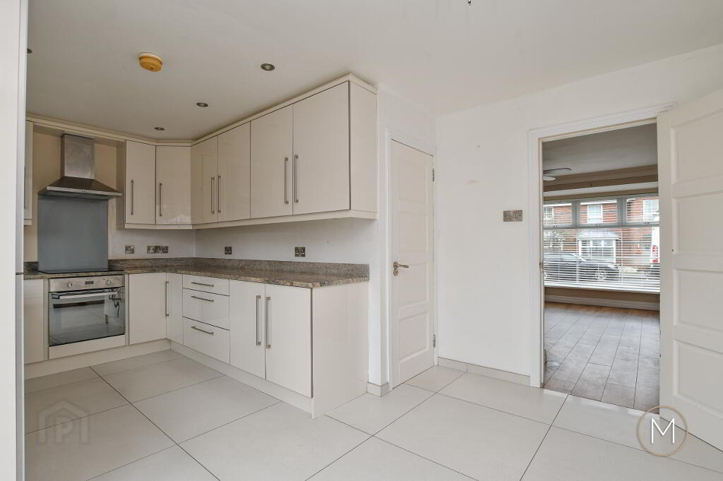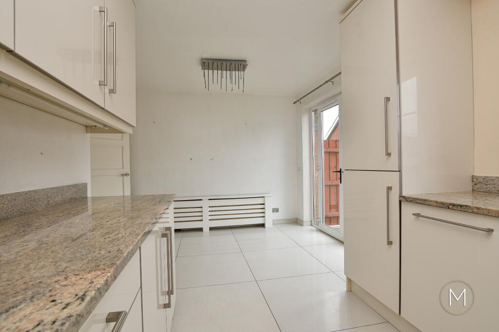 The heart of the home is undoubtedly the modern, fully integrated kitchen, finished with granite work surfaces and quality appliances. Adjacent lies a useful utility room with a convenient ground-floor WC. The open-plan dining area offers an excellent space for family meals and entertaining, with PVC double doors opening directly to the enclosed rear garden — perfect for children, pets, and summer barbecues.