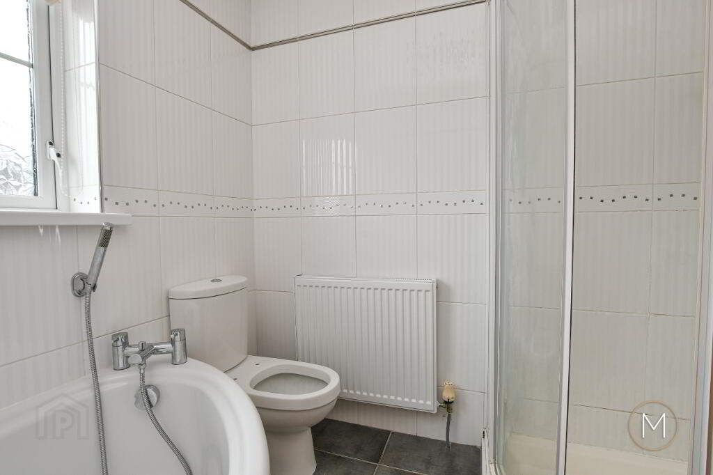 Modern white shower suite comprising of low flush W.C; wash hand basin; tiled shower cubicle with electric shower; tiled floor and walls; spotlighting; chrome towel radiator