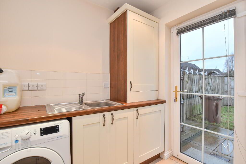To the rear of the home is a modern, open-plan fully fitted kitchen with ample dining space. This is a fantastic area for everyday family living and entertaining alike. The dining area benefits from sliding patio doors which open directly onto the enclosed rear garden, allowing for seamless indoor-outdoor living. A separate utility room provides additional storage and workspace and offers the convenience of its own external door. A downstairs WC completes the ground floor accommodation.