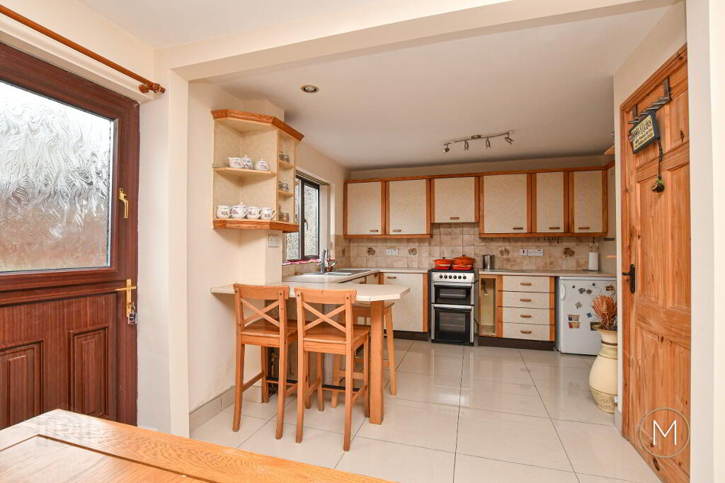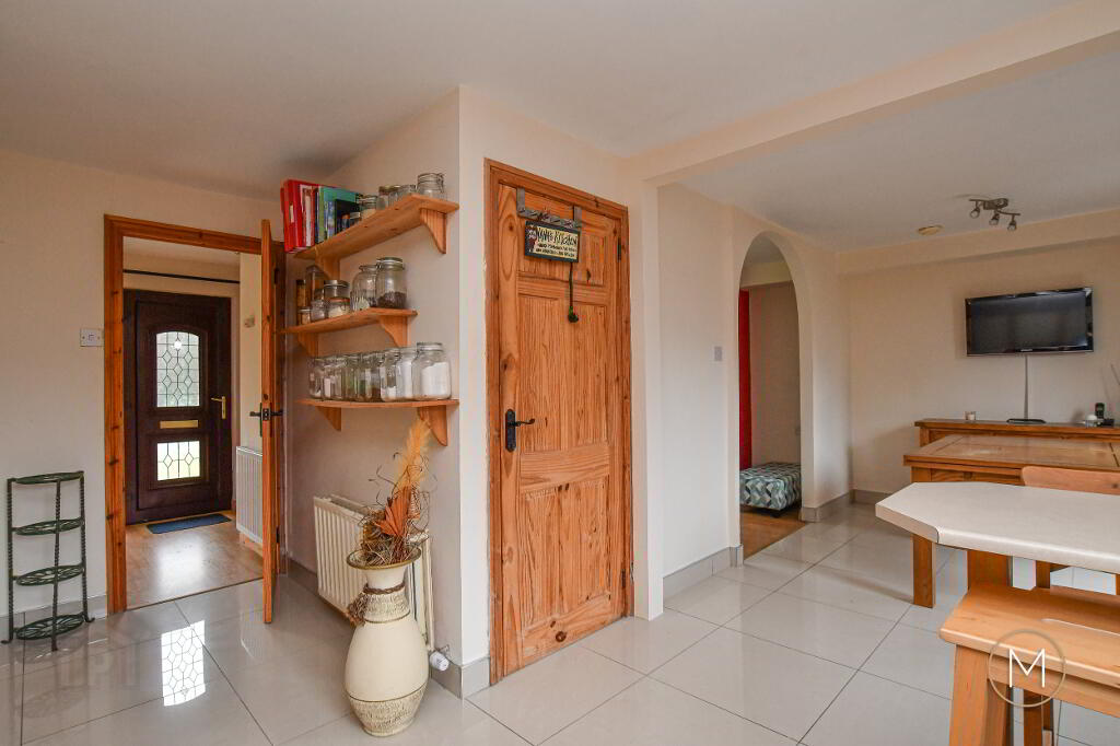 The property offers generous accommodation both internally and externally. On entering, you are welcomed by a spacious entrance hall finished with attractive wood flooring, setting the tone for the rest of the home. The cosy living room features a fireplace with fire, creating a warm and inviting focal point and benefits from an open archway leading through to the dining room. The dining area is finished with tiled flooring and flows seamlessly into the open-plan fitted kitchen, which offers a wide range of units and excellent storage, complemented further by a separate storage cupboard.