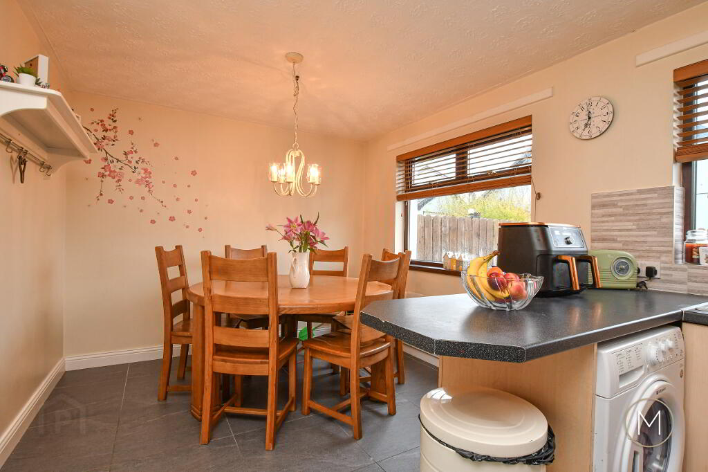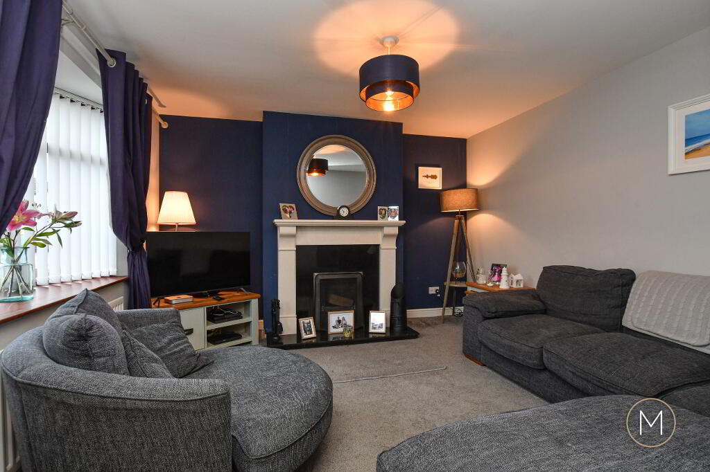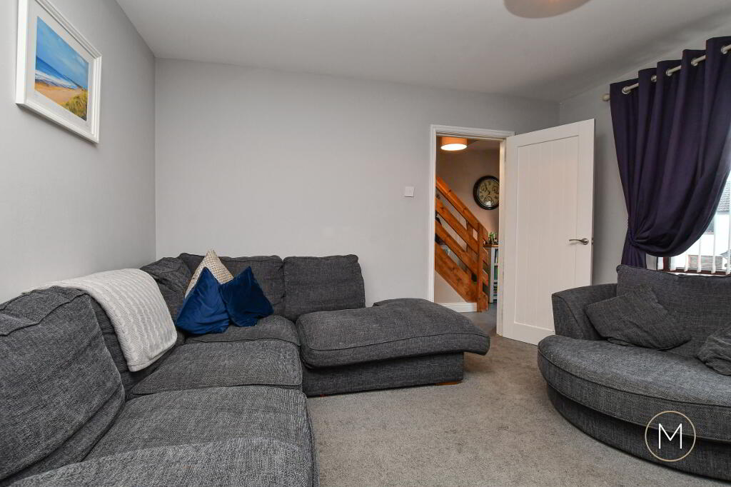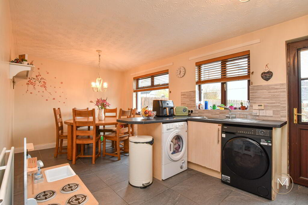 Internally, the accommodation is both bright and well proportioned. The entrance hall provides a useful cloaks area, ideal for modern family living. To the front of the property is a cosy living room, enhanced by a feature fireplace with a real open fire – a perfect space to relax and unwind. To the rear, the home opens into a very bright open-plan kitchen and dining area, creating an inviting hub for family meals and entertaining.