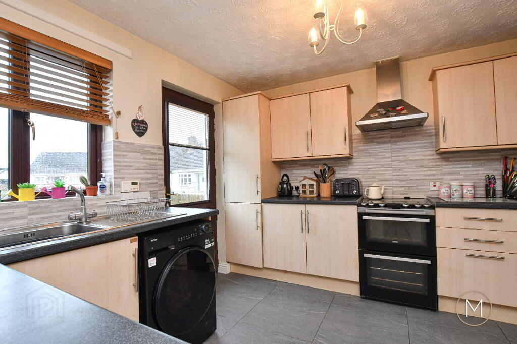 Fitted kitchen comprising of an excellent range of high and low level units; space for cooker; stainless steel extractor fan; tiled floor; tiled splashback; plumbed for washing machine; space for dryer; single drainer stainless steel sink unit; glass panelled PVC door to rear garden