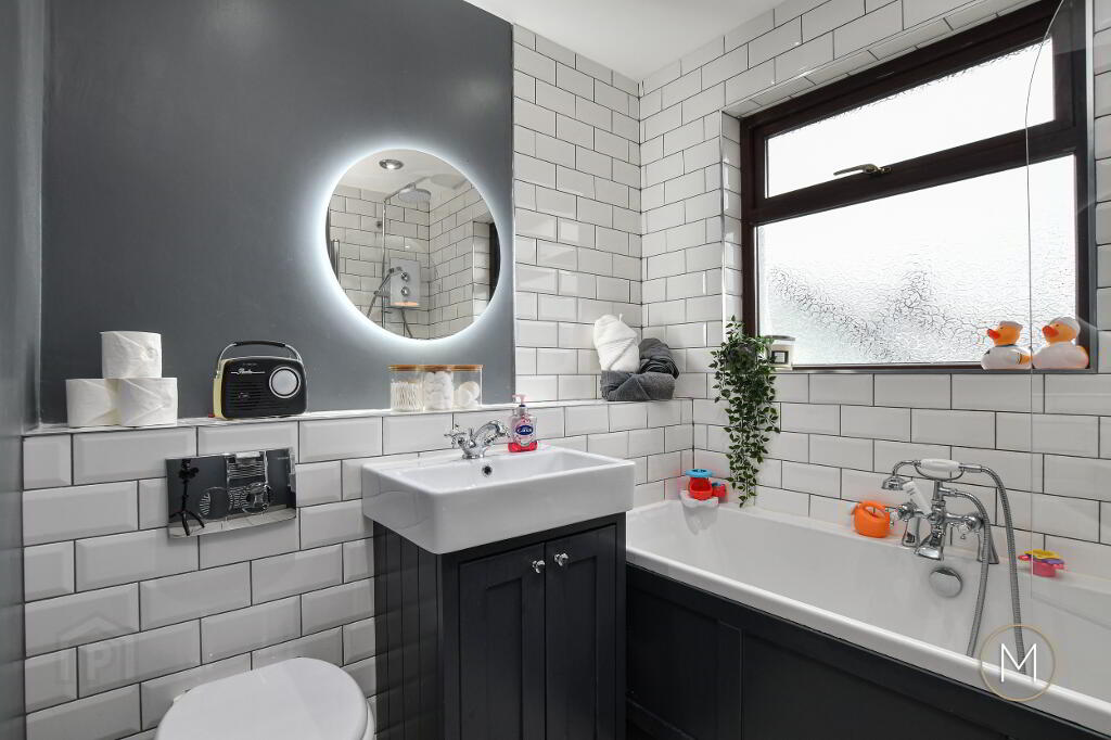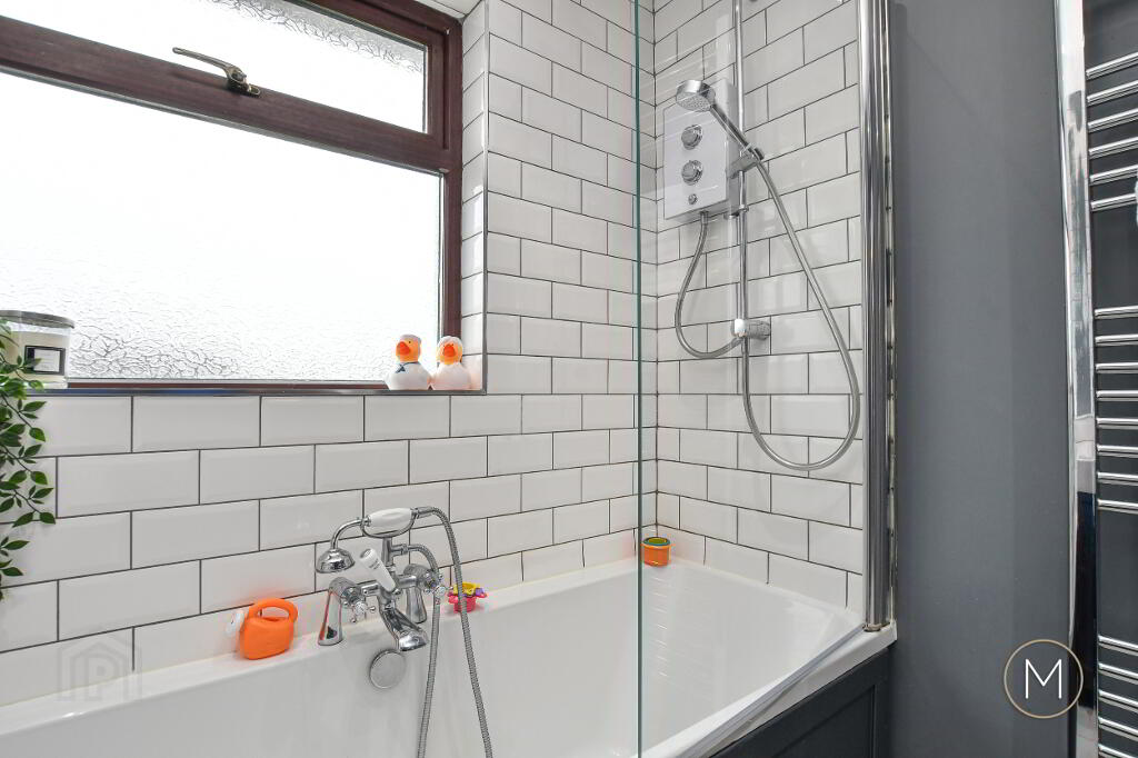 Modern bathroom finished in a white suite comprising of a panelled bath with chrome mixer taps and telephone style attachment, electric shower overhead and glass shower screen; wash hand basin with vanity unit; low flush W.C; chrome heated towel radiator; spotlighting; tiled floor; partially tiled walls; illuminated mirror