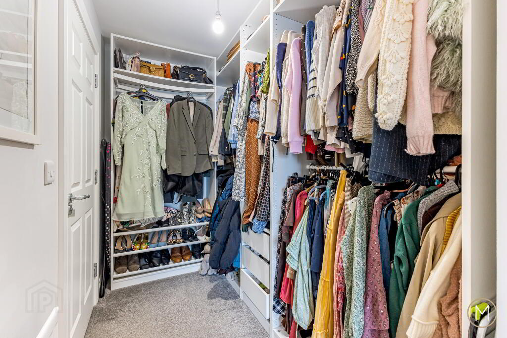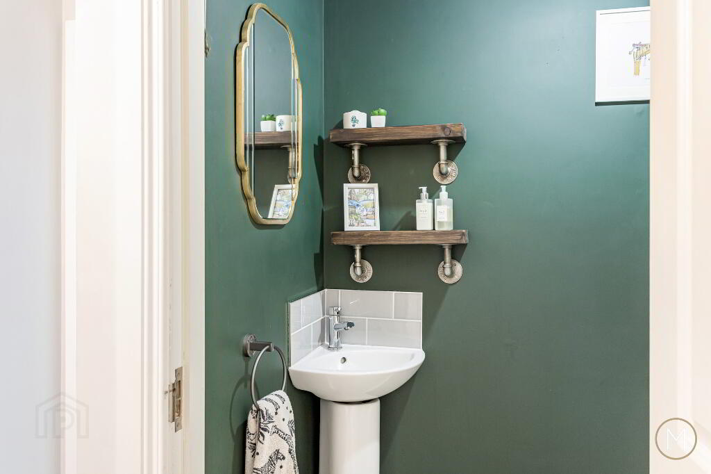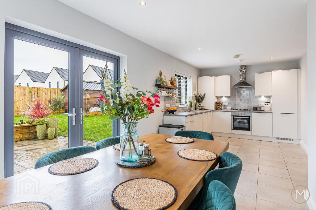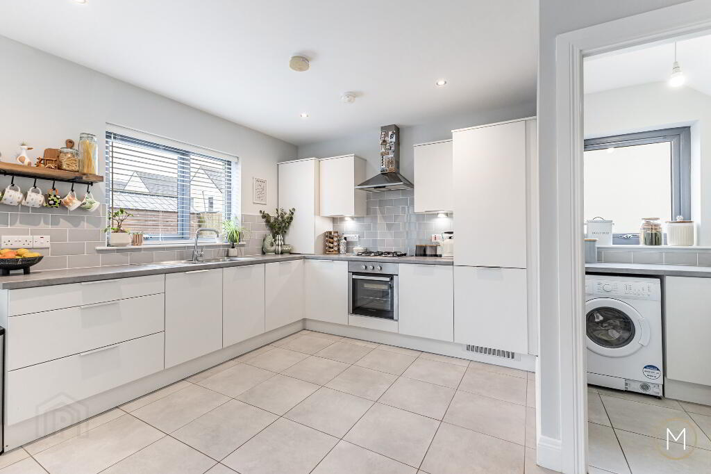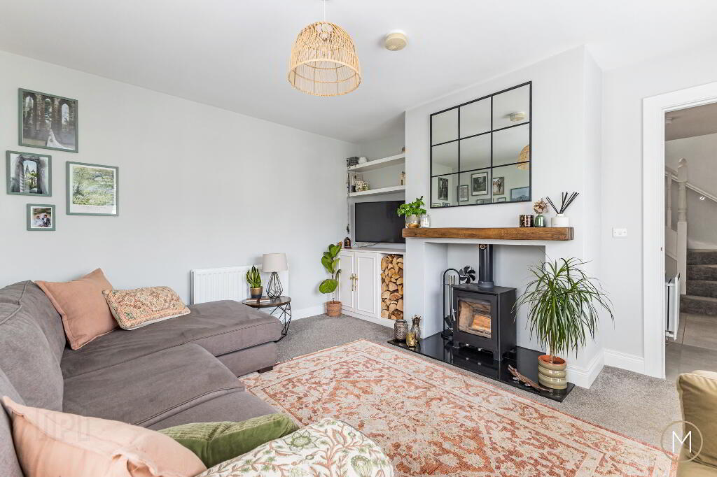 On entering, you are greeted by a spacious and inviting entrance hallway with practical understairs storage and a stylish ground floor W.C. The bright living room enjoys dual-aspect windows, flooding the space with natural light, and features a multi-fuel burning stove, complemented by bespoke display shelving and cabinetry — creating a warm yet modern focal point.