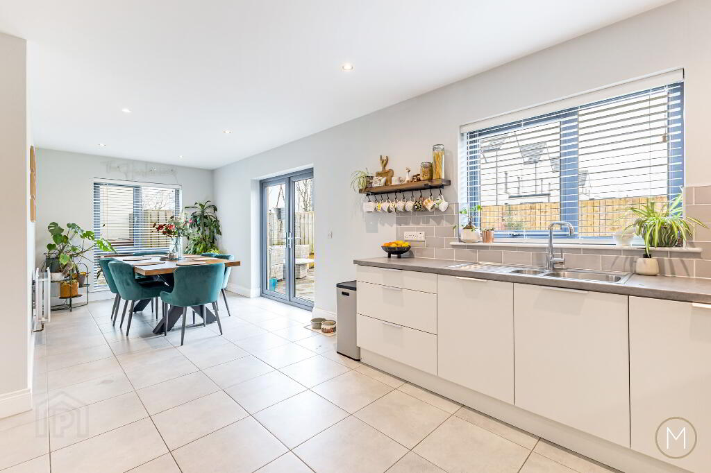 To the rear, the stunning open-plan kitchen and dining area is perfectly suited to modern family life and entertaining. The kitchen is well equipped with a range of integrated appliances, soft-close doors, and ambient lighting, all finished to a high contemporary standard. Double doors from the dining area open directly onto the rear garden, seamlessly blending indoor and outdoor living. A separate utility room adds further practicality.