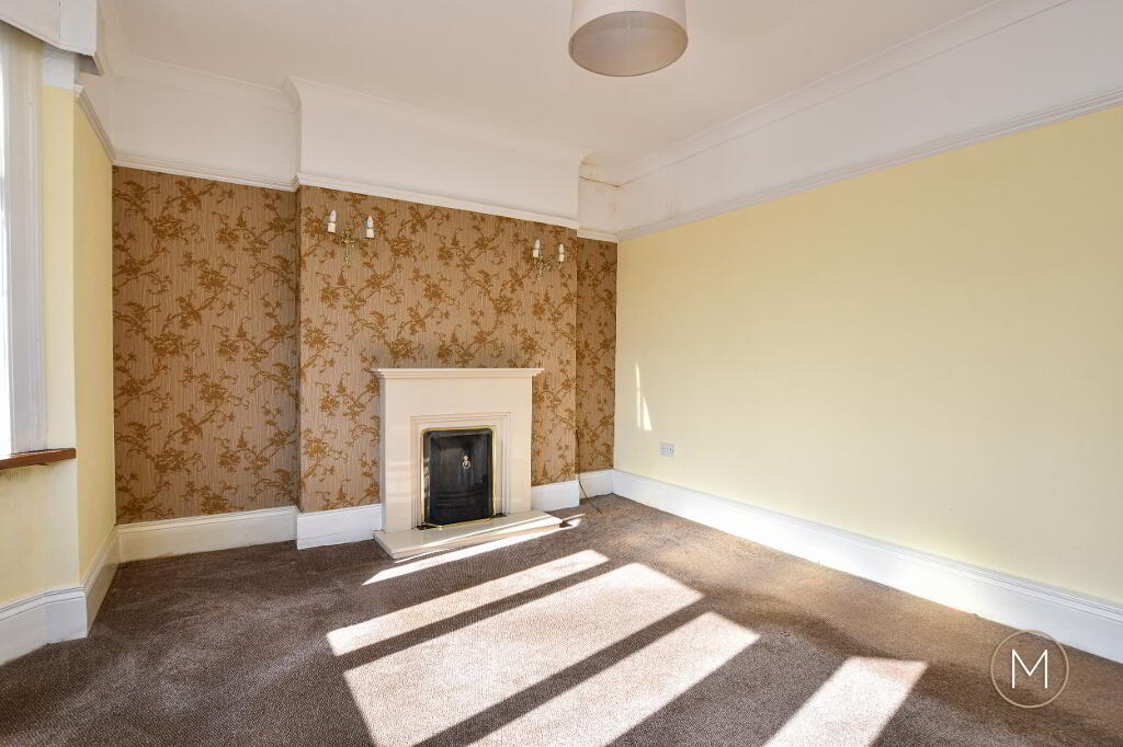 Feature fireplace with open fire; wall lighting; bay window