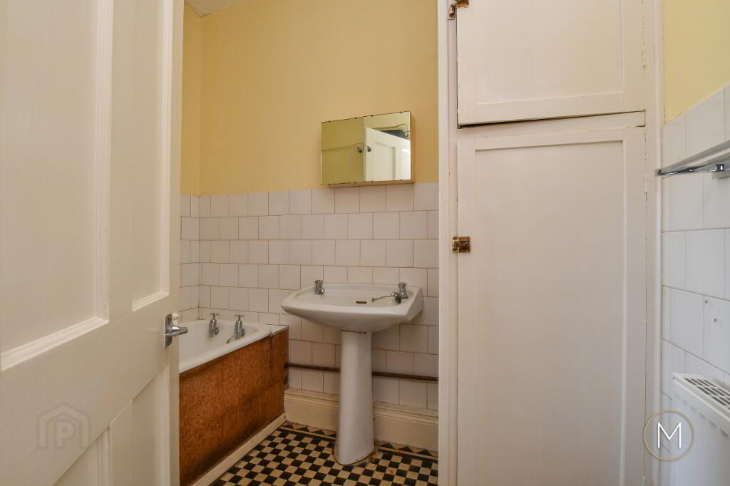 White suite comprising of panelled bath with chrome taps; wash hand basin; low flush W.C; partially tiled walls; tiled floor; hotpress