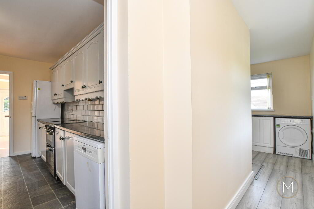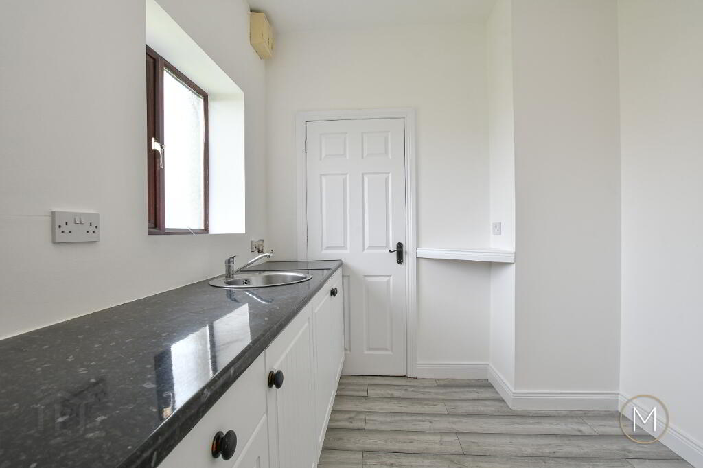 Formica style work surface; plumbed for washing machine; space for dryer; wood laminate flooring; glass panelled PVC door to rear garden