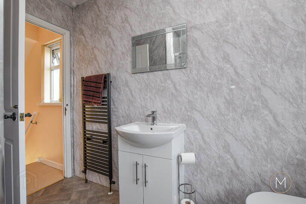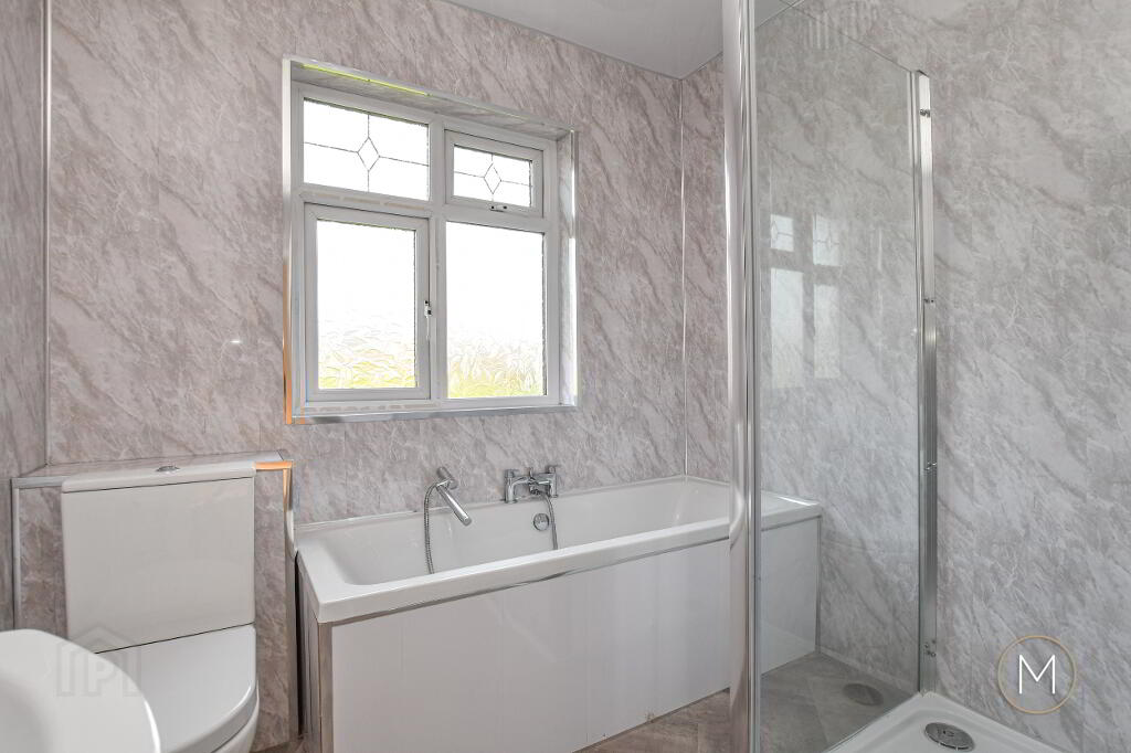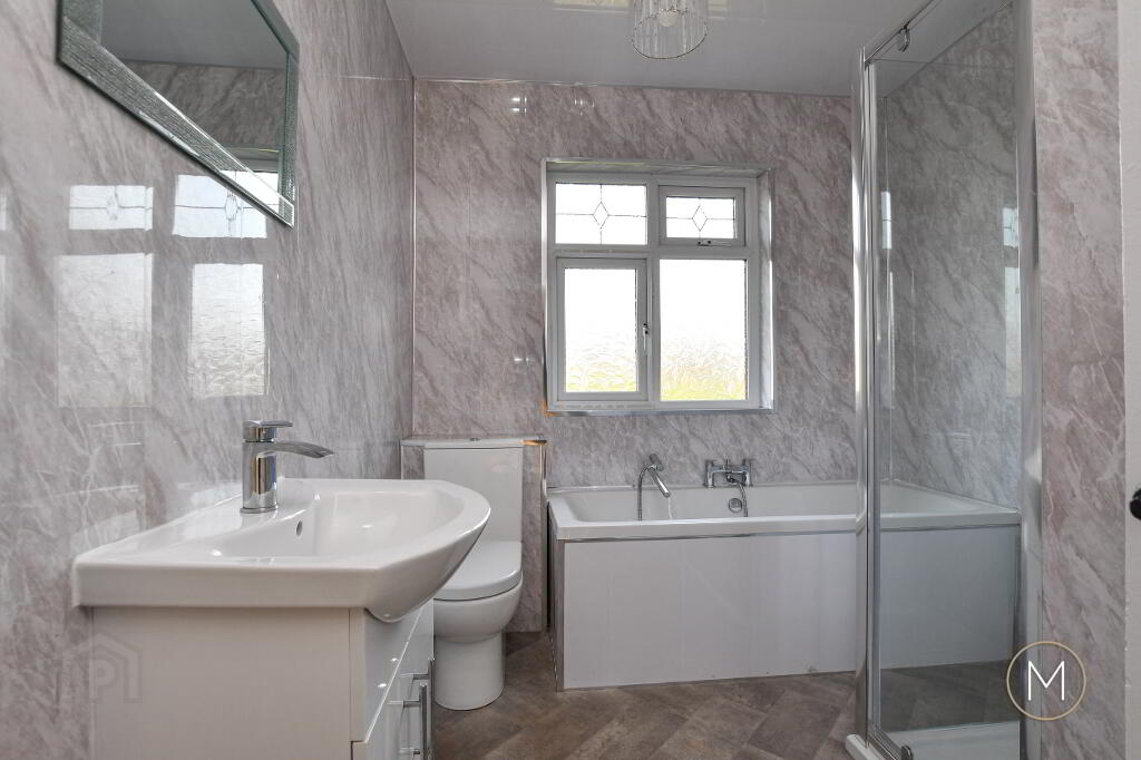 Upstairs, the property comprises three well-proportioned bedrooms, each offering comfortable accommodation. The principal bedroom is particularly impressive, featuring a range of built-in furniture for ample storage. The contemporary family bathroom is finished in a modern white suite and includes both a bath and a separate shower cubicle, catering to all preferences.