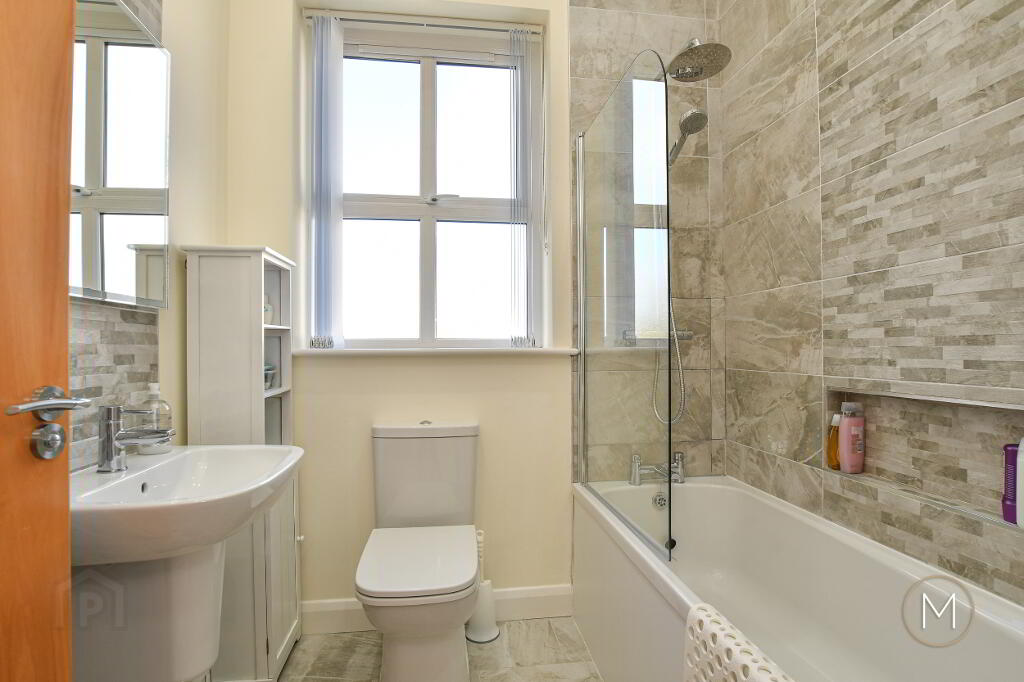 Contemporary fitted white suite comprising of panelled bath with chrome mixer taps and Drench style shower with separate attachment and glass shower screen; low flush W.C; wash hand basin; chrome towel rail; extractor fan; tiled floor; partially tiled walls; illuminated mirror