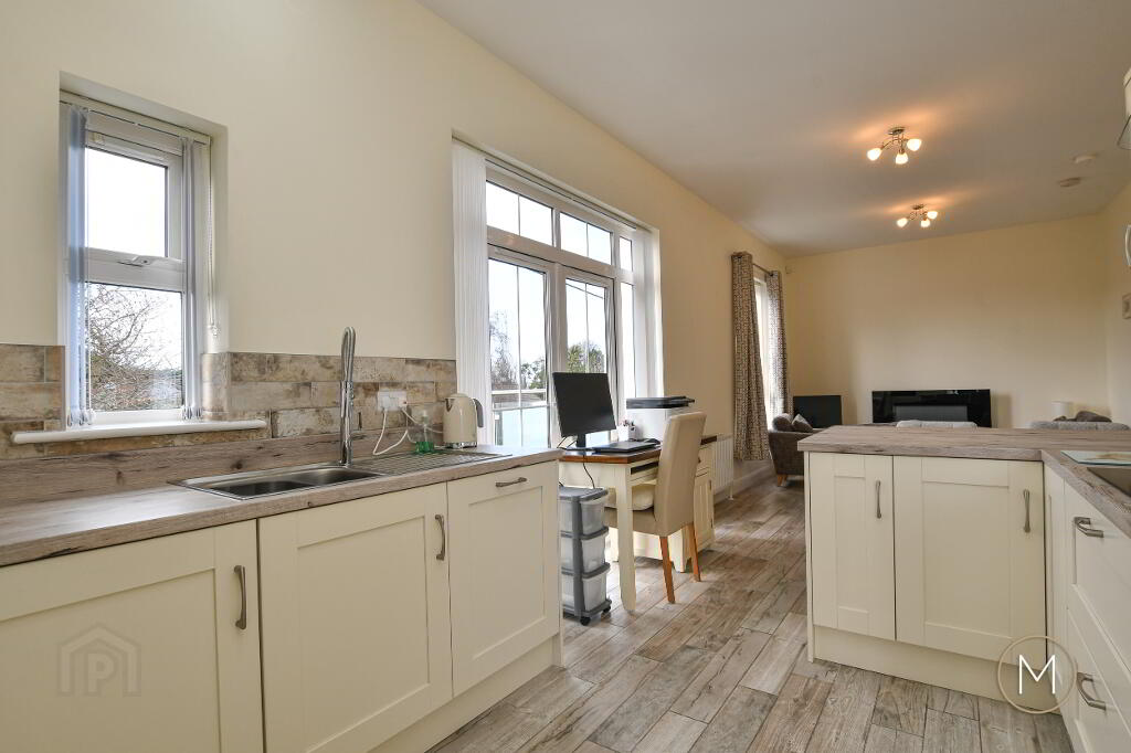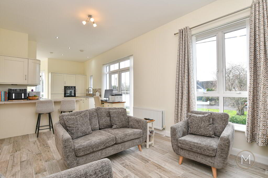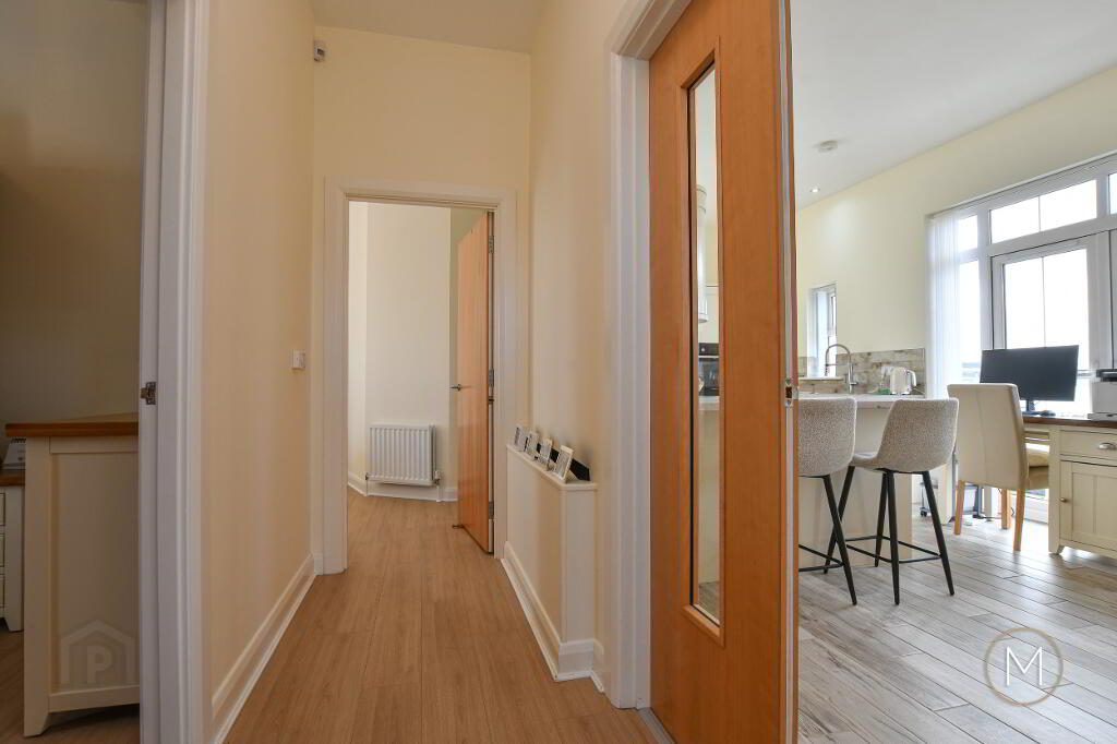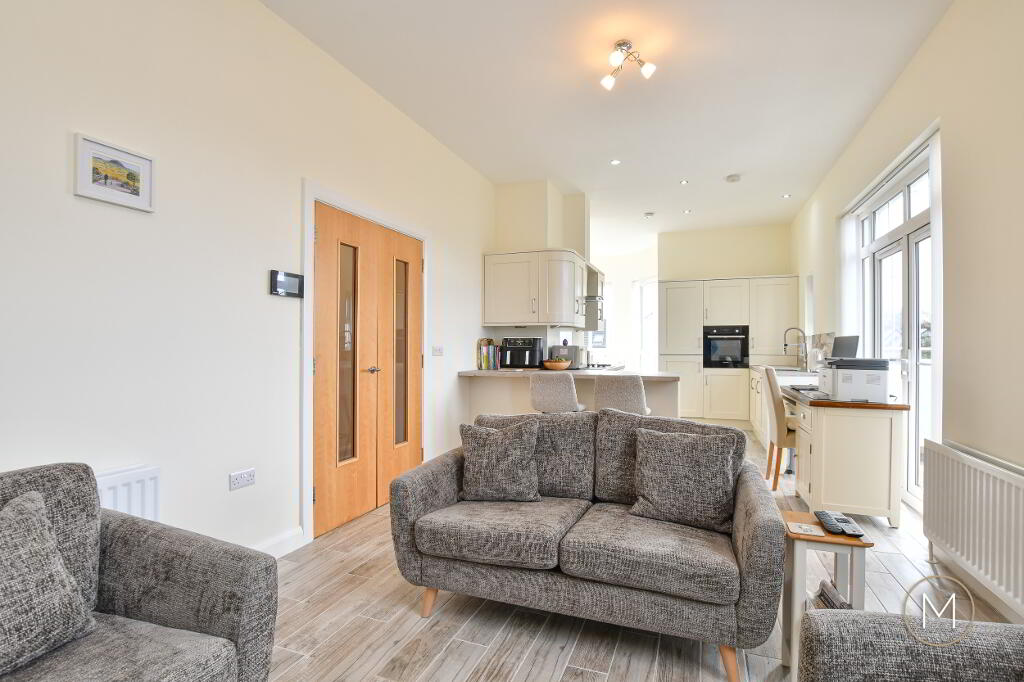 Accessed via a tiled entrance, a private staircase—enhanced with recently fitted carpet—leads to the main hallway, where a stunning wood laminate floor creates an immediate sense of warmth and style. From here, glazed double doors open into a bright and spacious open plan living area, thoughtfully designed to combine relaxation, dining, and cooking in one impressive space.