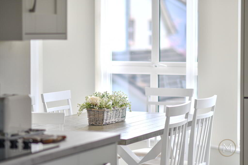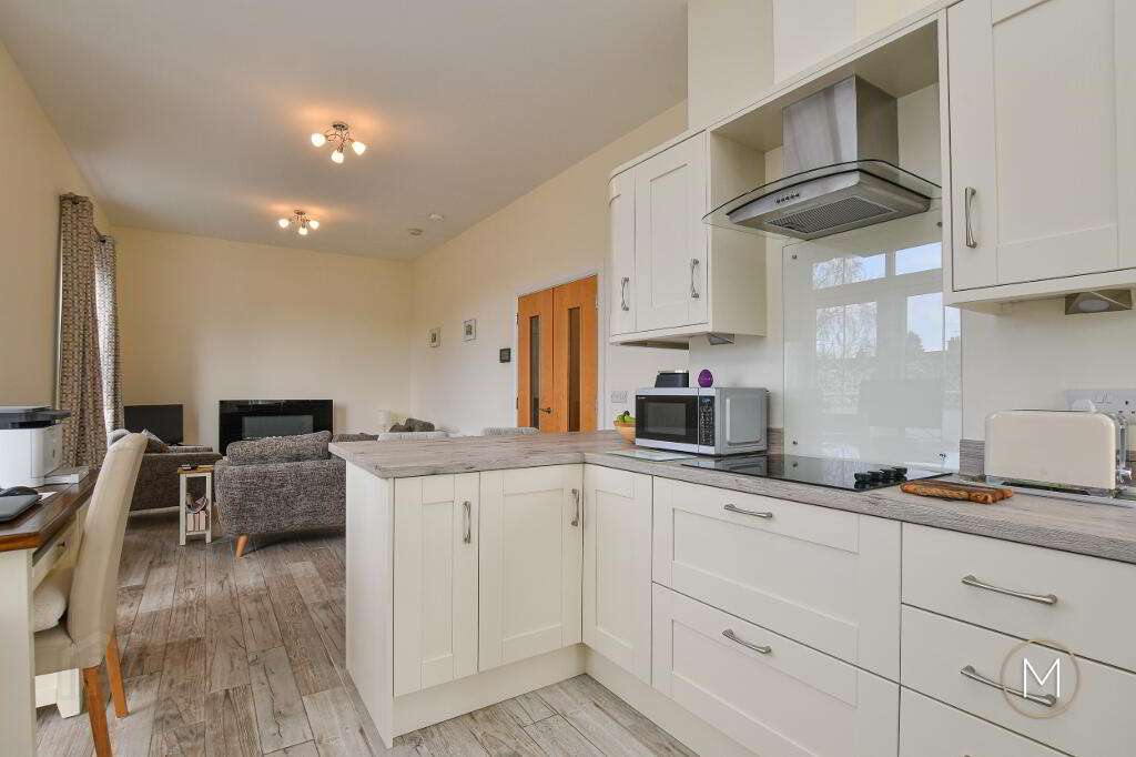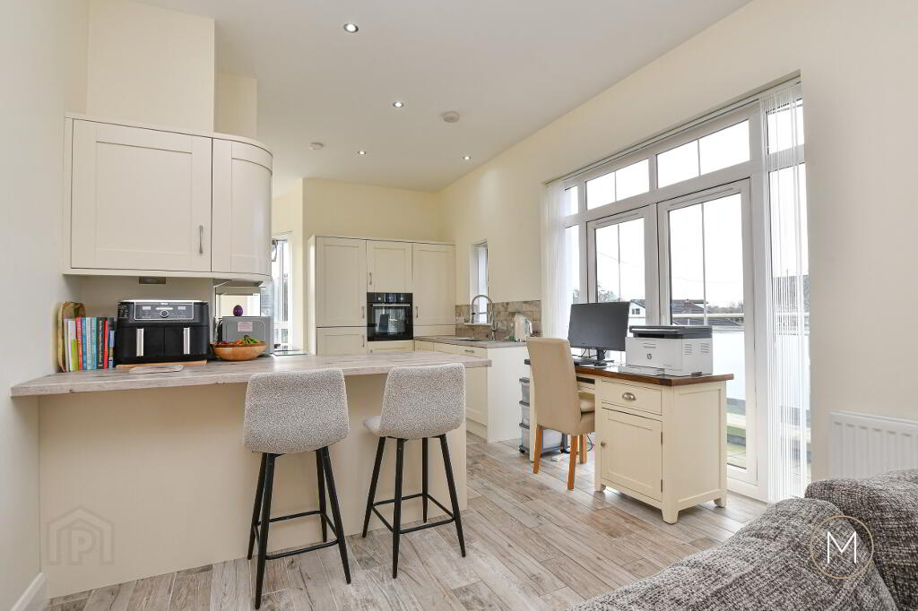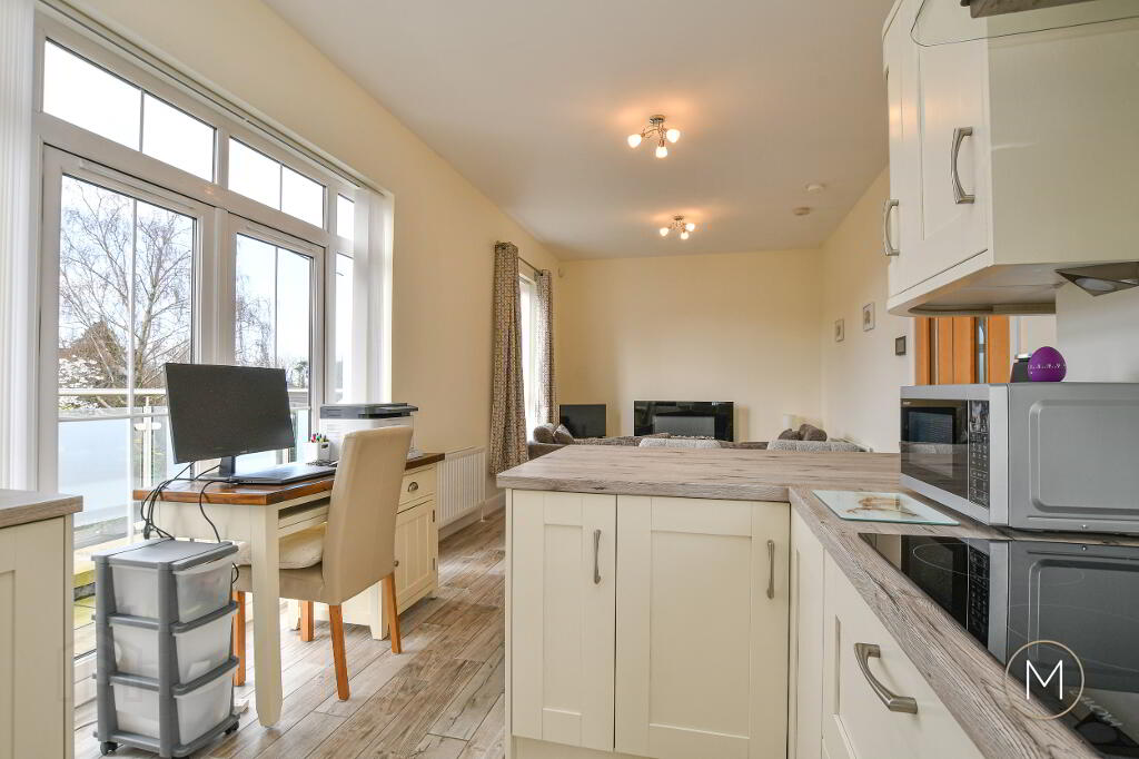 The living room benefits from contemporary LED spotlighting and flows seamlessly into the modern kitchen and dining area. The kitchen itself has been tastefully upgraded with solid wood ivory doors, complemented by contrasting work surfaces and integrated appliances for a sleek, streamlined finish. A dedicated dining area provides the perfect setting for entertaining, while a breakfast bar offers more informal seating. Double doors lead out to a private balcony with a stylish glass balustrade—ideal for enjoying morning coffee or evening relaxation.
