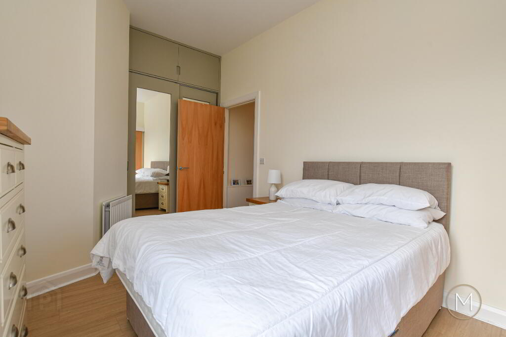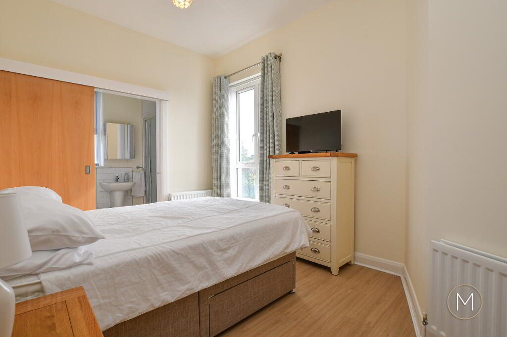 The apartment boasts two well-proportioned double bedrooms. The master bedroom features built-in mirrored sliderobes and a luxurious ensuite, complete with a contemporary shower enclosure and drench-style fitting. The main bathroom has also been upgraded to a high standard, offering a modern suite with a bath and overhead shower.