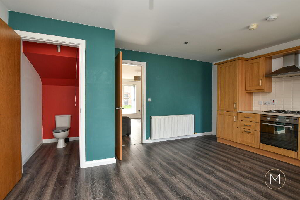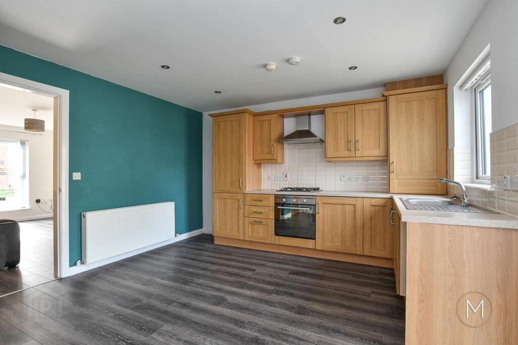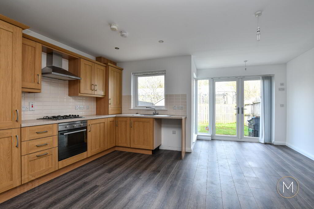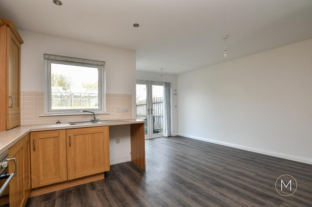 Modern fully fitted kitchen comprising of an excellent range of high and low level units; integrated fridge freezer; integrated cooker, gas hob and stainless steel extractor fan; tiled splashback; wood laminate flooring; plumbed for washing machine; Formica style work surfaces; concealed gas boiler; spotlighting; single drainer stainless steel sink unit; PVC patio doors to back garden