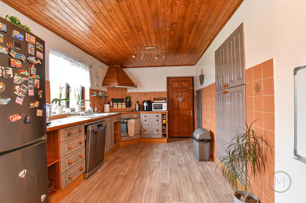 Fully fitted kitchen comprising a good range of high and low level units; integrated cooker, ceramic hob and extractor fan; plumbed for dishwasher; wine racking; 1 ½ bowl stainless steel unit; tiled splashback; laminated work surfaces; pine panelled ceiling